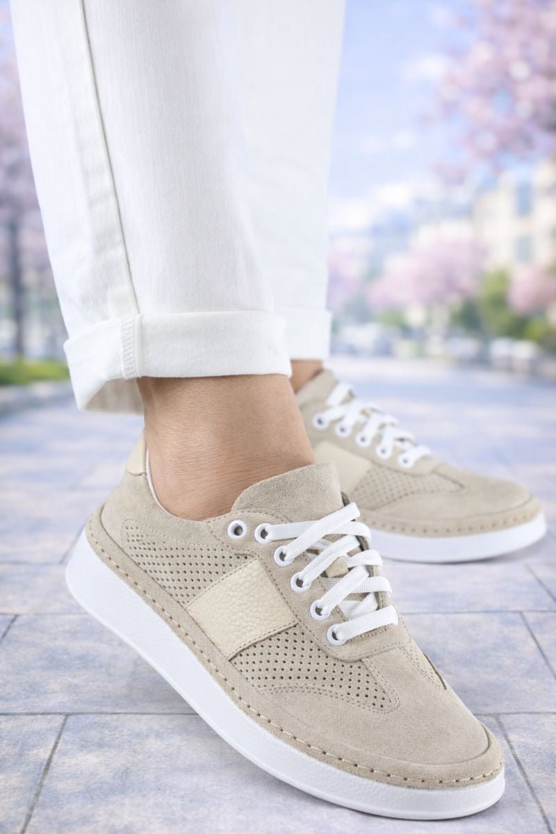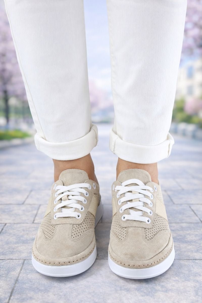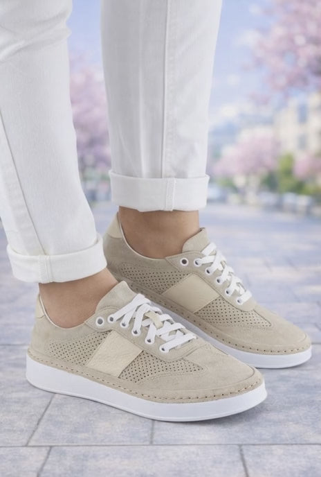 Sneakersii damă bej sunt alegerea ideală pentru un look curat, feminin și ușor de asortat. Realizați din piele naturală și velur perforat, acest model oferă respirabilitate optimă și confort sporit pe tot parcursul zilei, fiind potrivit pentru sezonul primăvară–vară.