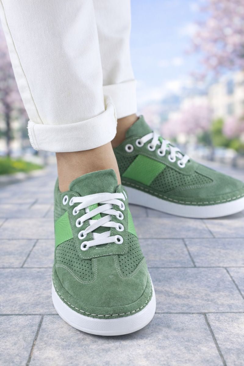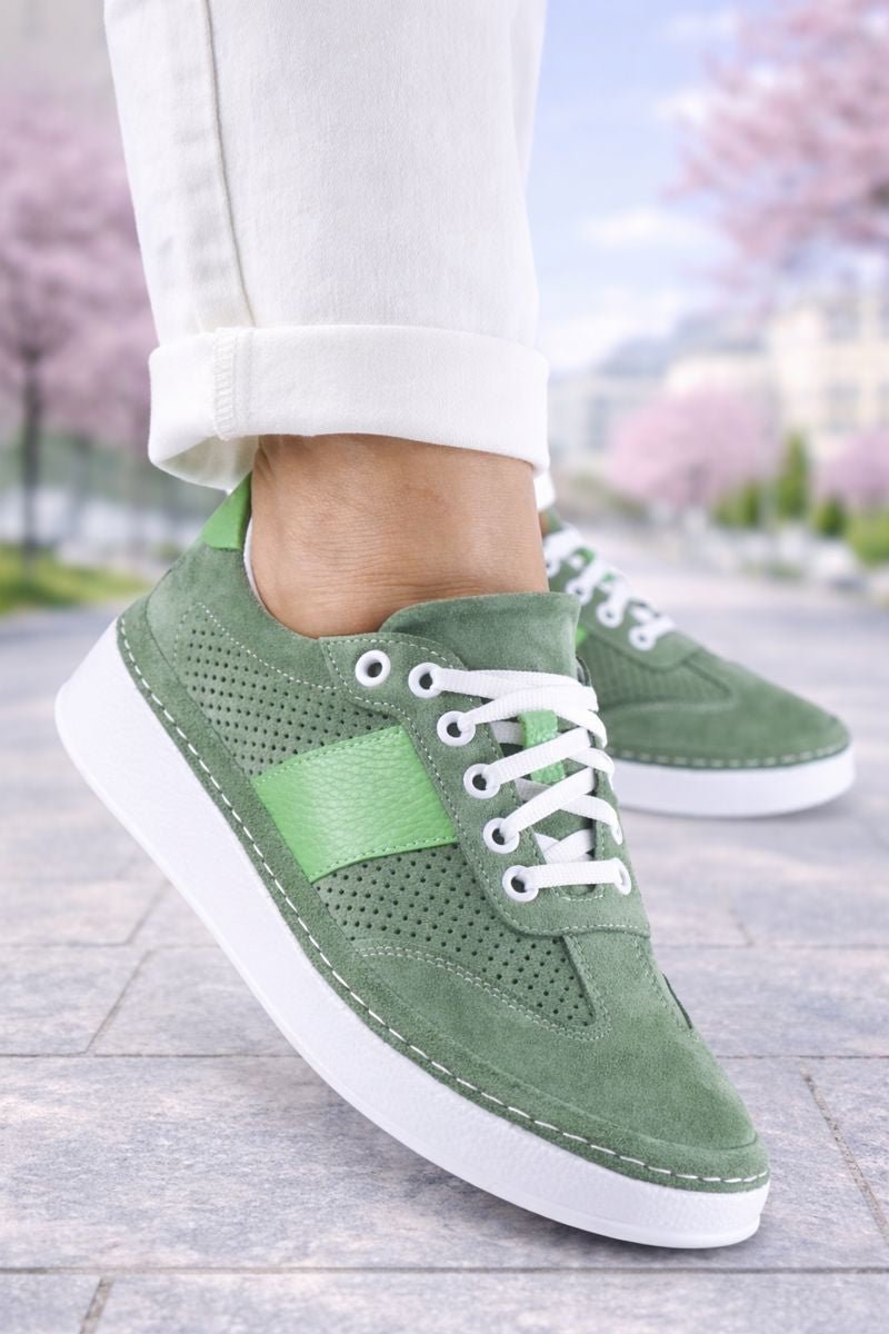 Sneakersii pentru damă în nuanță verde sunt alegerea ideală pentru un stil urban fresh, confortabil și modern. Realizați din piele naturală și velur perforat, aceștia permit o bună circulație a aerului, fiind perfecți pentru sezonul primăvară–vară.