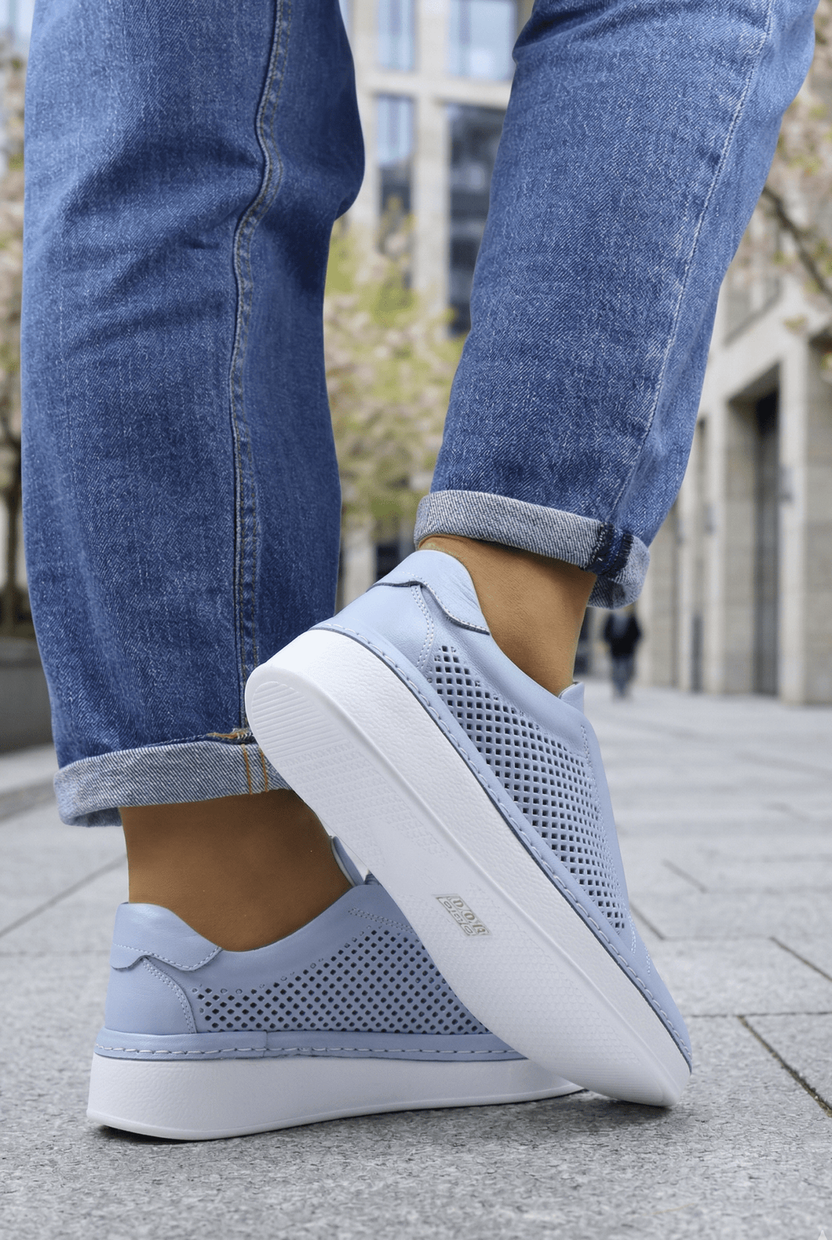 Acești pantofi casual damă, realizați din piele naturală albastri baby blue, sunt alegerea ideală pentru sezonul cald, oferind un echilibru perfect între confort, lejeritate și design modern. Perforațiile laterale permit o bună circulație a aerului, menținând piciorul confortabil pe tot parcursul zilei.