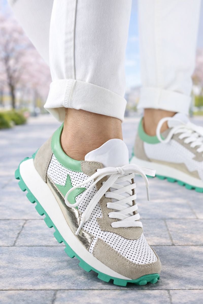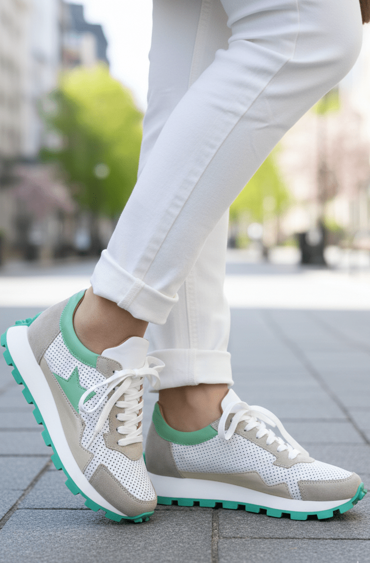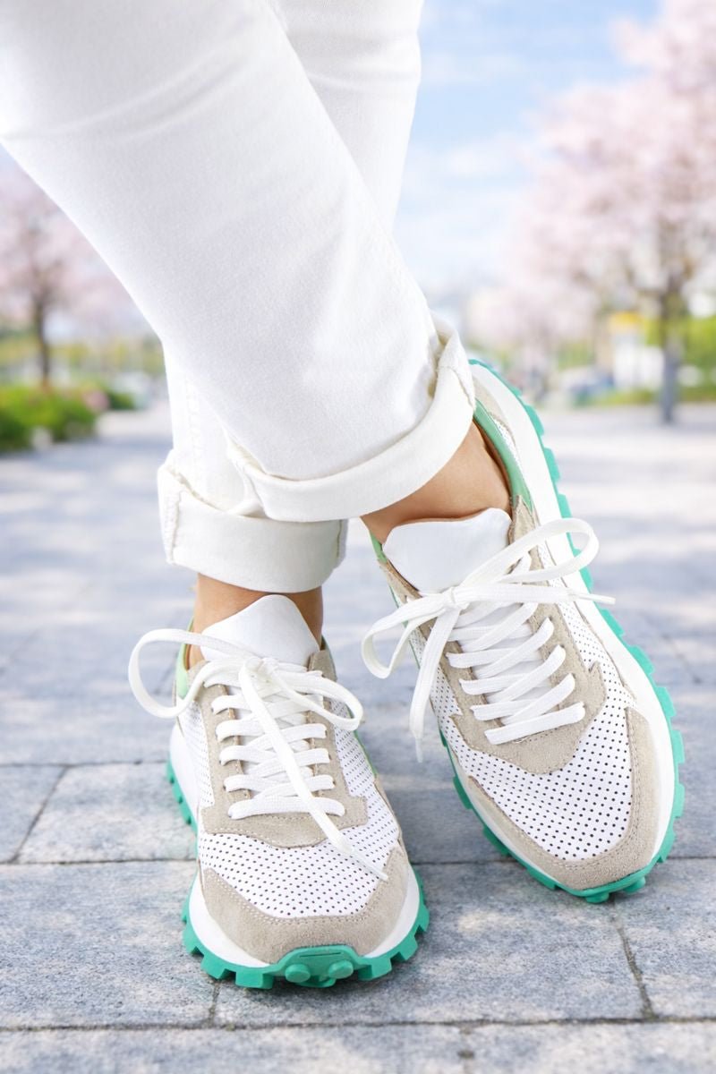 Accentele verzi – aplicate pe partea din spate, laterale și pe talpă – adaugă un contrast elegant și un aer energic, ideal pentru ținutele casual de primăvară și vară. Talpa groasă, ușoară și antiderapantă asigură stabilitate și amortizare optimă la fiecare pas.