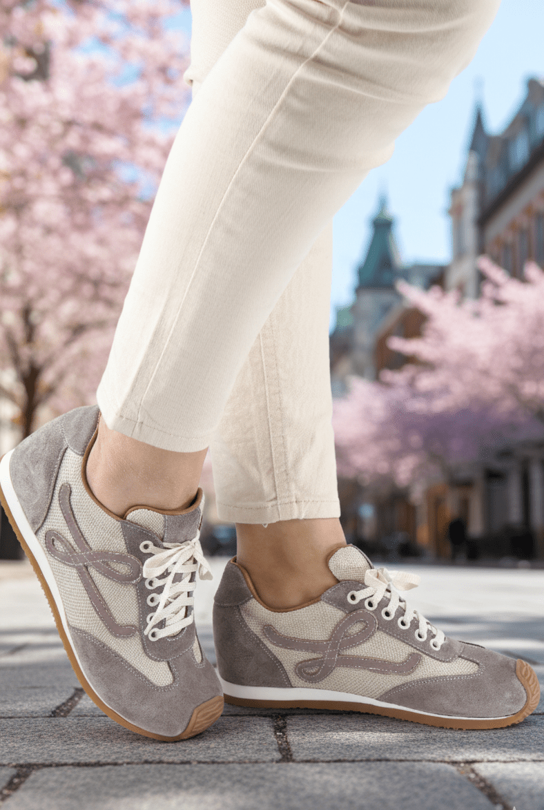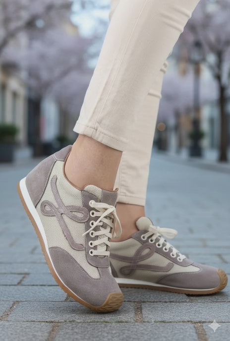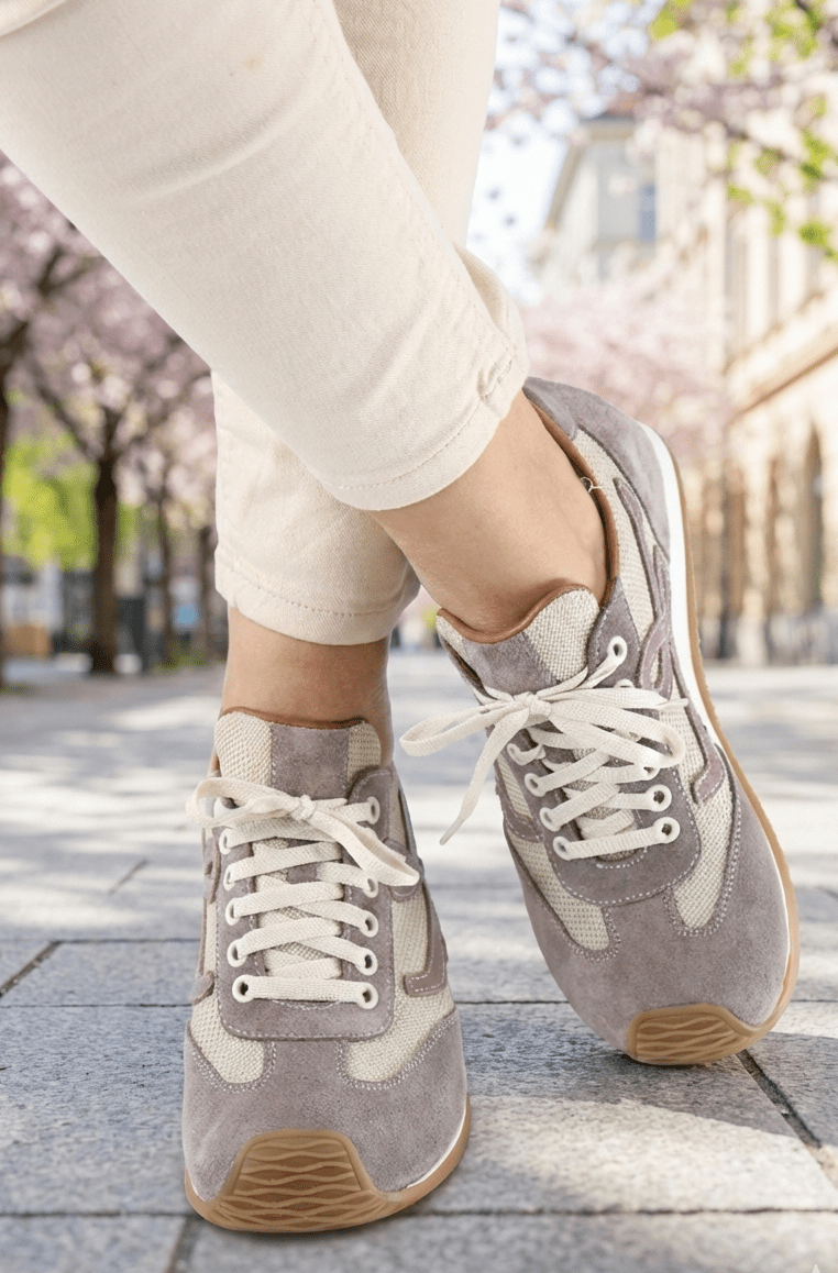 Pantofii sport casual damă gri-taupe sunt realizați din piele naturală velur combinată cu material textil respirabil, oferind un echilibru ideal între confort, flexibilitate și stil. Designul modern este evidențiat de aplicația decorativă laterală și de contrastul elegant dintre nuanța gri-taupe și tonurile neutre.