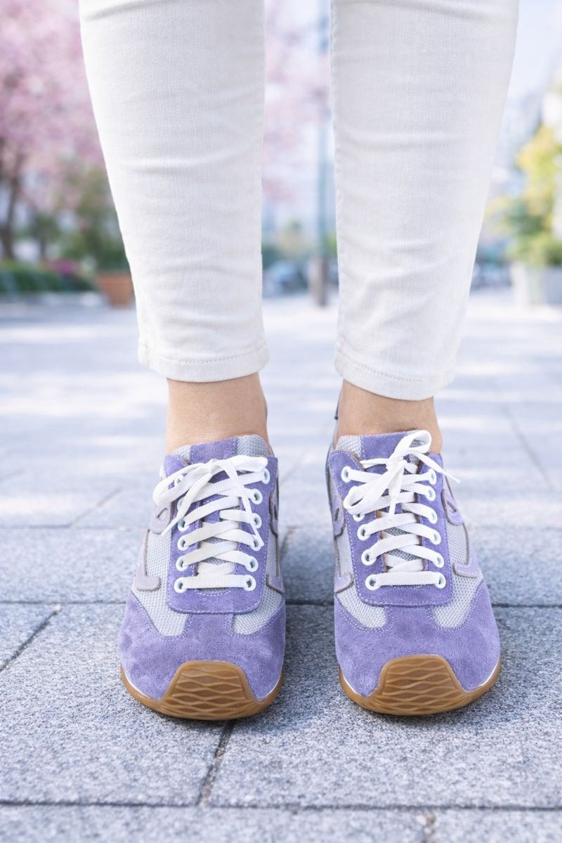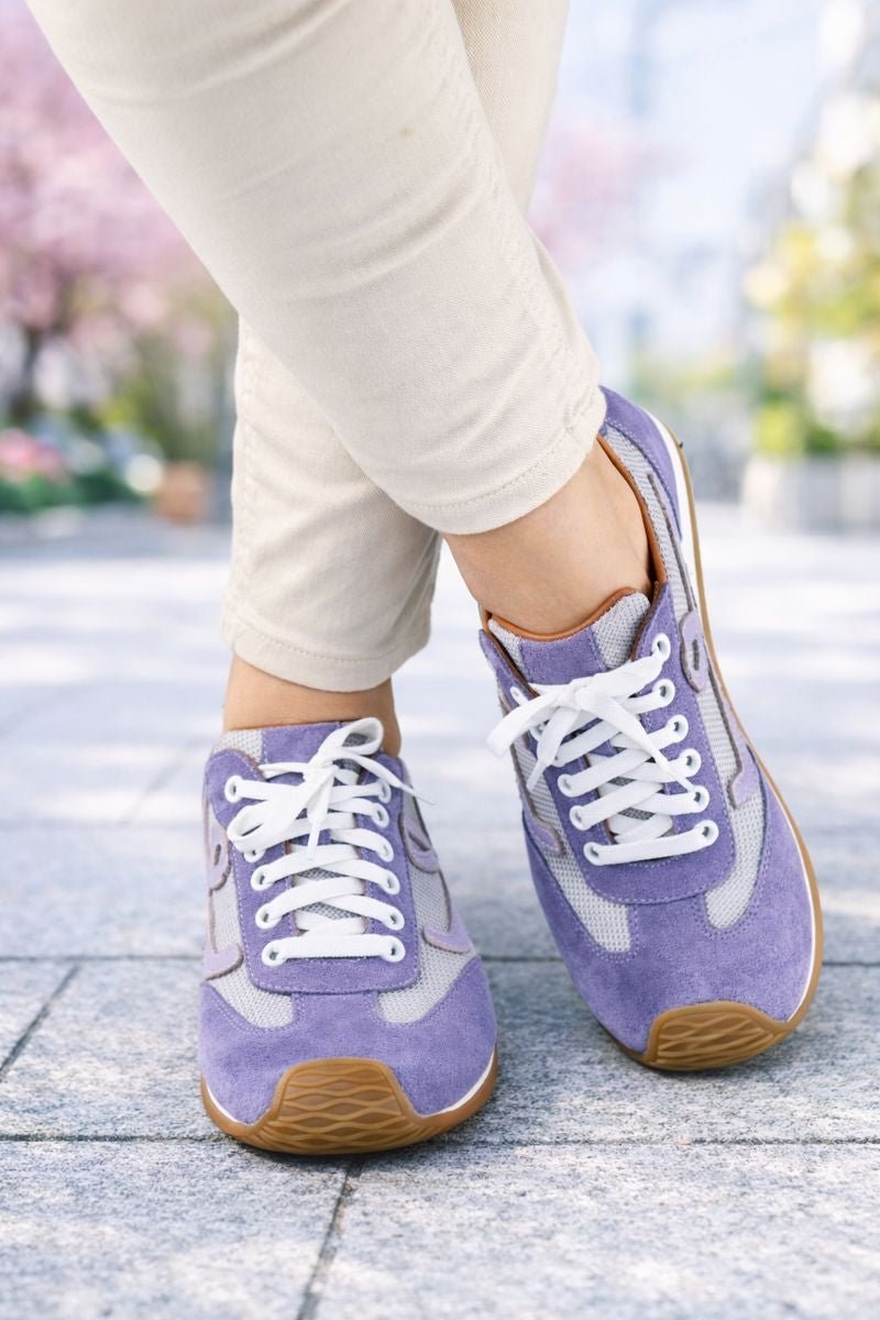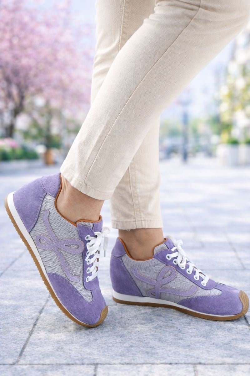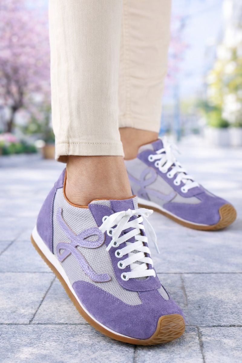 Pantofii sport casual damă lila sunt realizați din piele naturală velur combinată cu material textil respirabil, oferind un echilibru ideal între confort, flexibilitate și stil. Designul modern este evidențiat de aplicația decorativă laterală și de contrastul elegant dintre nuanța lila și tonurile neutre.