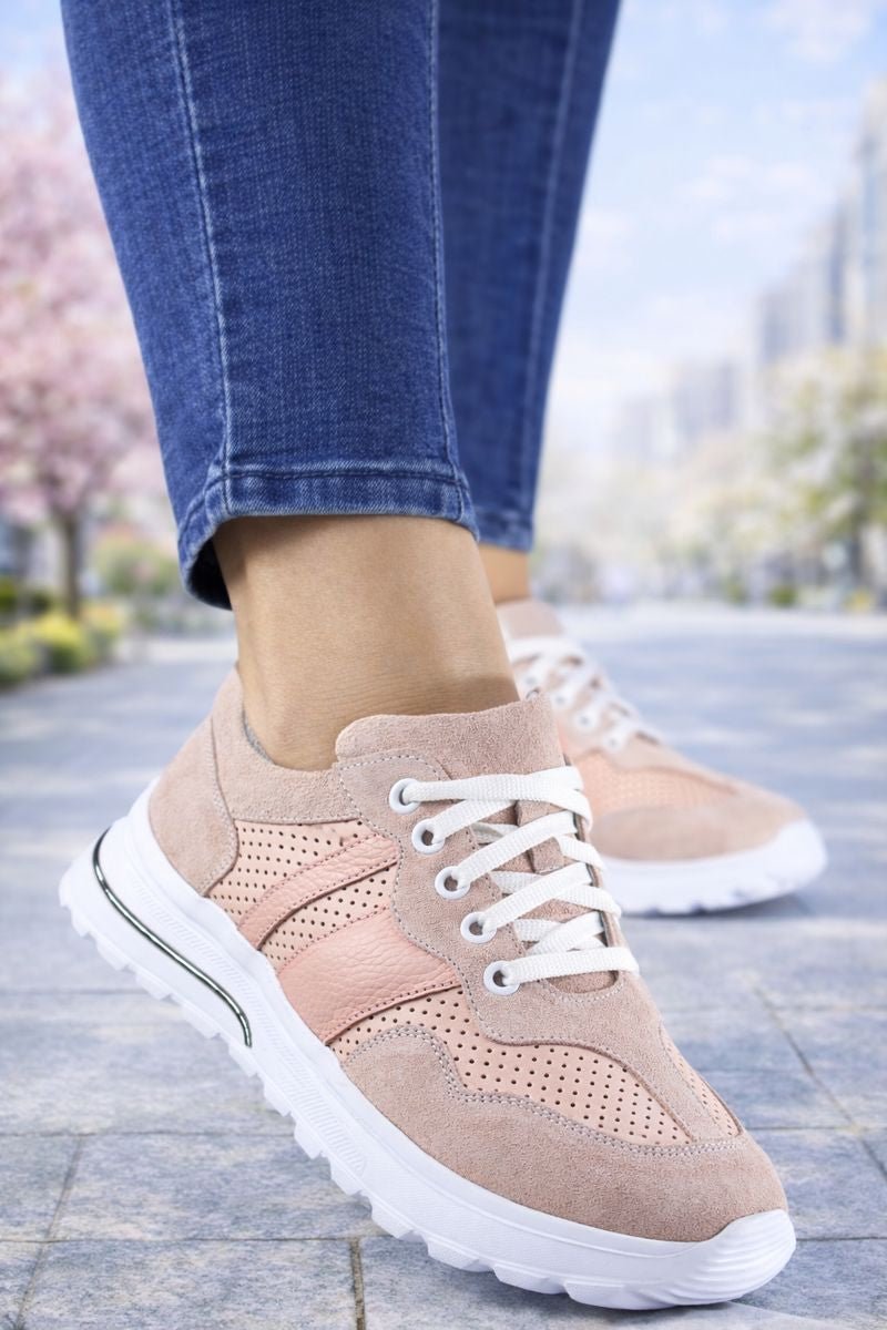 Pantofii sport casual damă Pudra sunt realizați din piele naturală de calitate superioară, cu finisaj mat și inserții perforate ce asigură un plus de respirabilitate. Designul echilibrat combină eleganța nuanței de PUDRA deschis cu un stil urban modern, ideal pentru purtare zilnică.