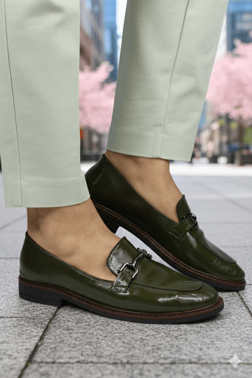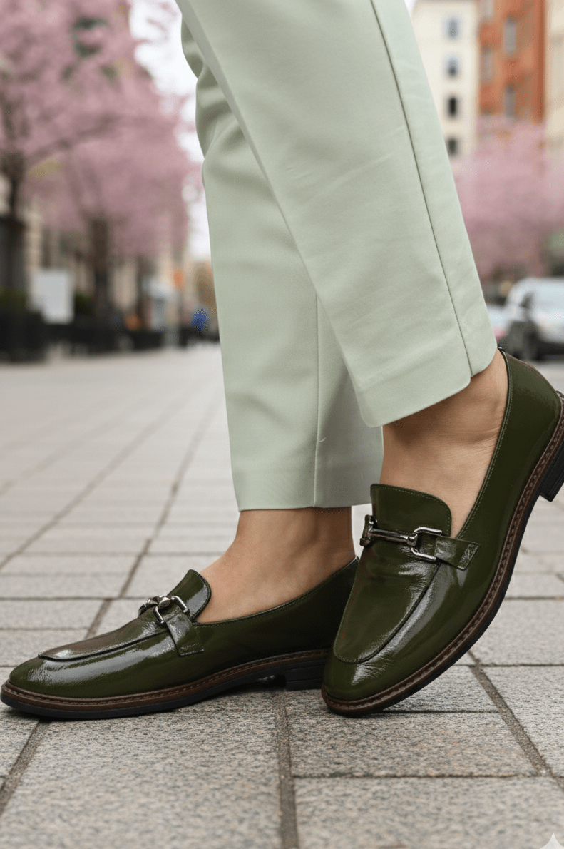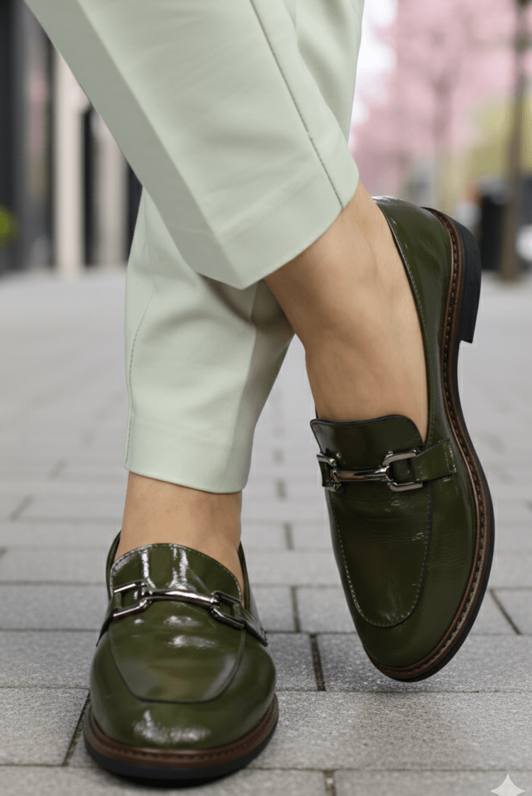 Pantofi gen Loafers din Piele Lac cu Accesoriu - LORE GREEN