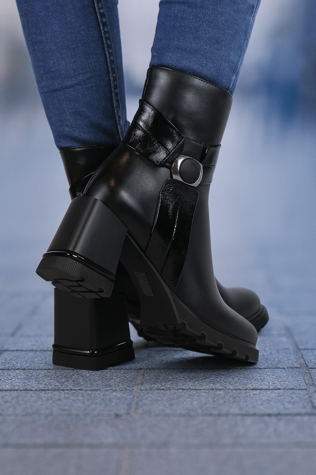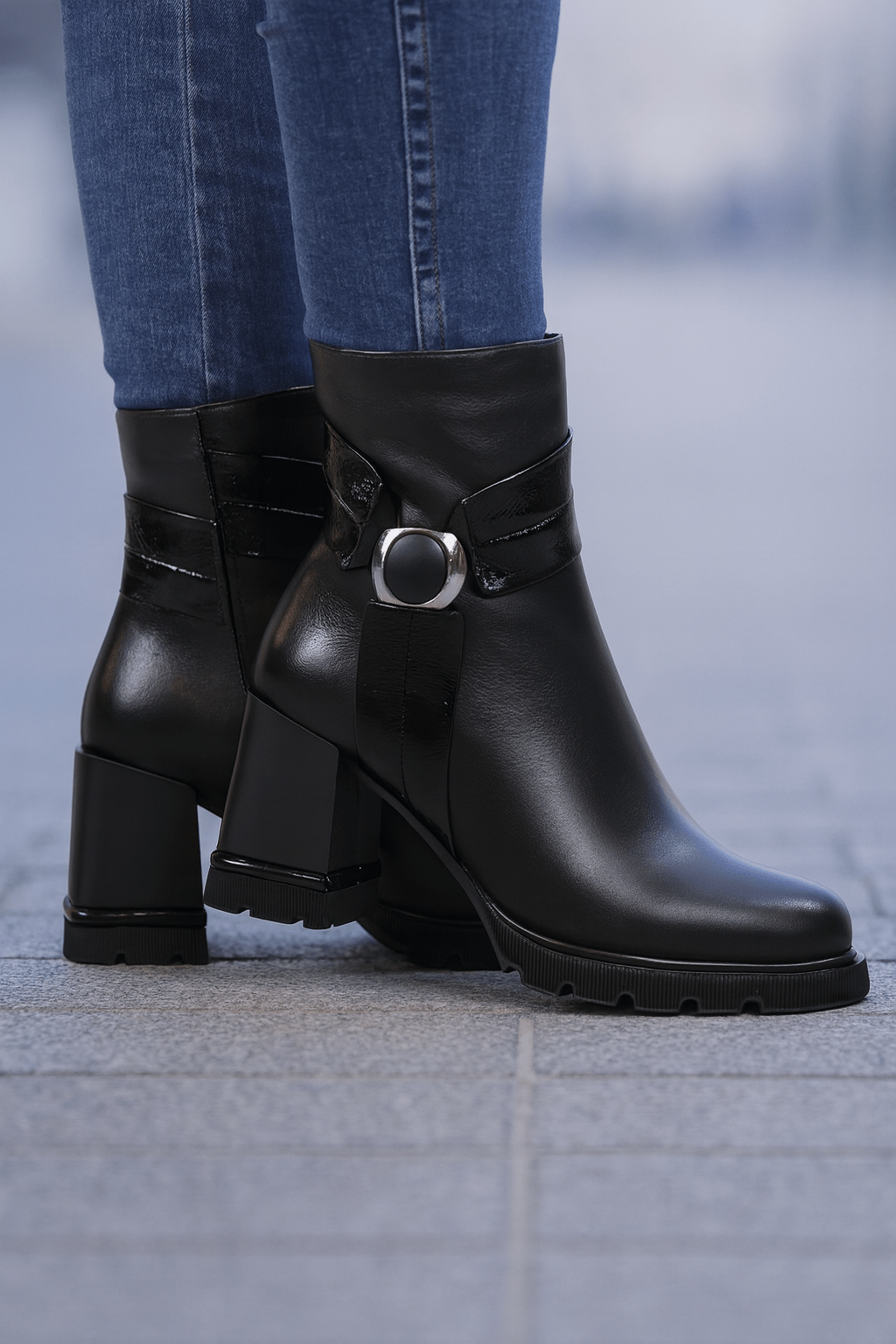 Descoperă eleganța perfectă pentru sezonul rece cu aceste ghete damă din piele naturală neagră, accentuate de detalii lăcuite și un accesoriu metalic rotund cu finisaj lucios. Designul rafinat și tocul gros oferă stabilitate, confort și un plus de feminitate.