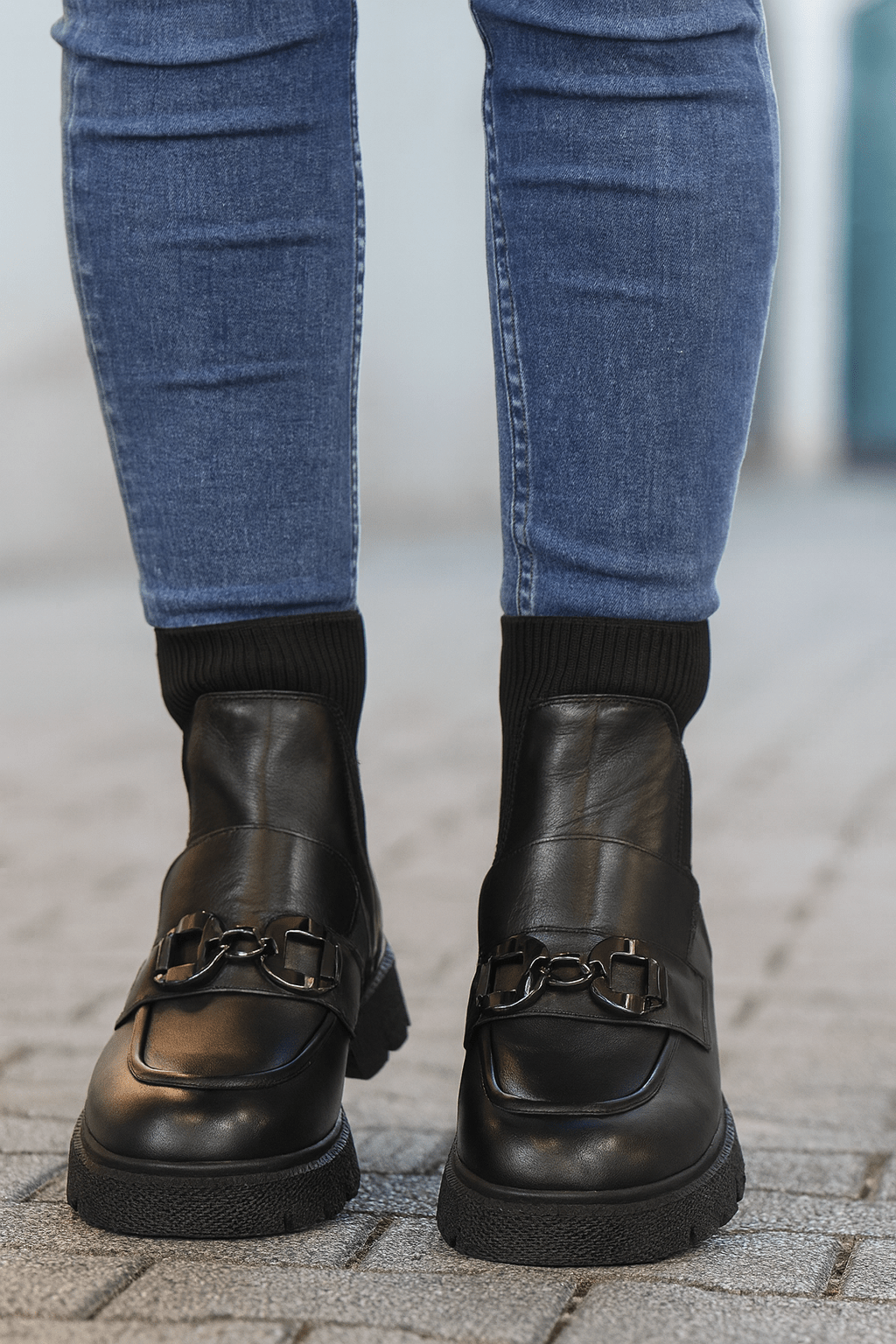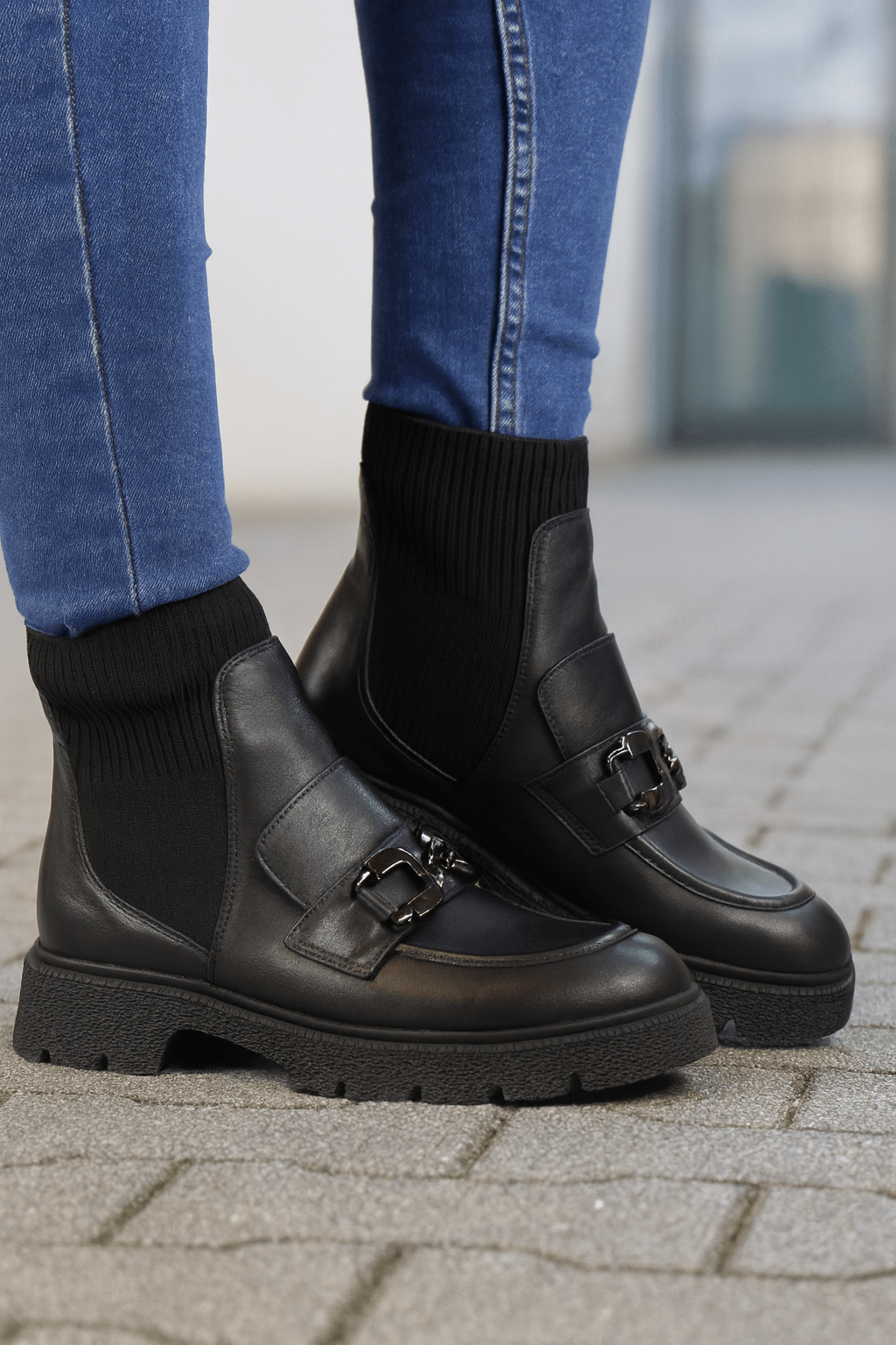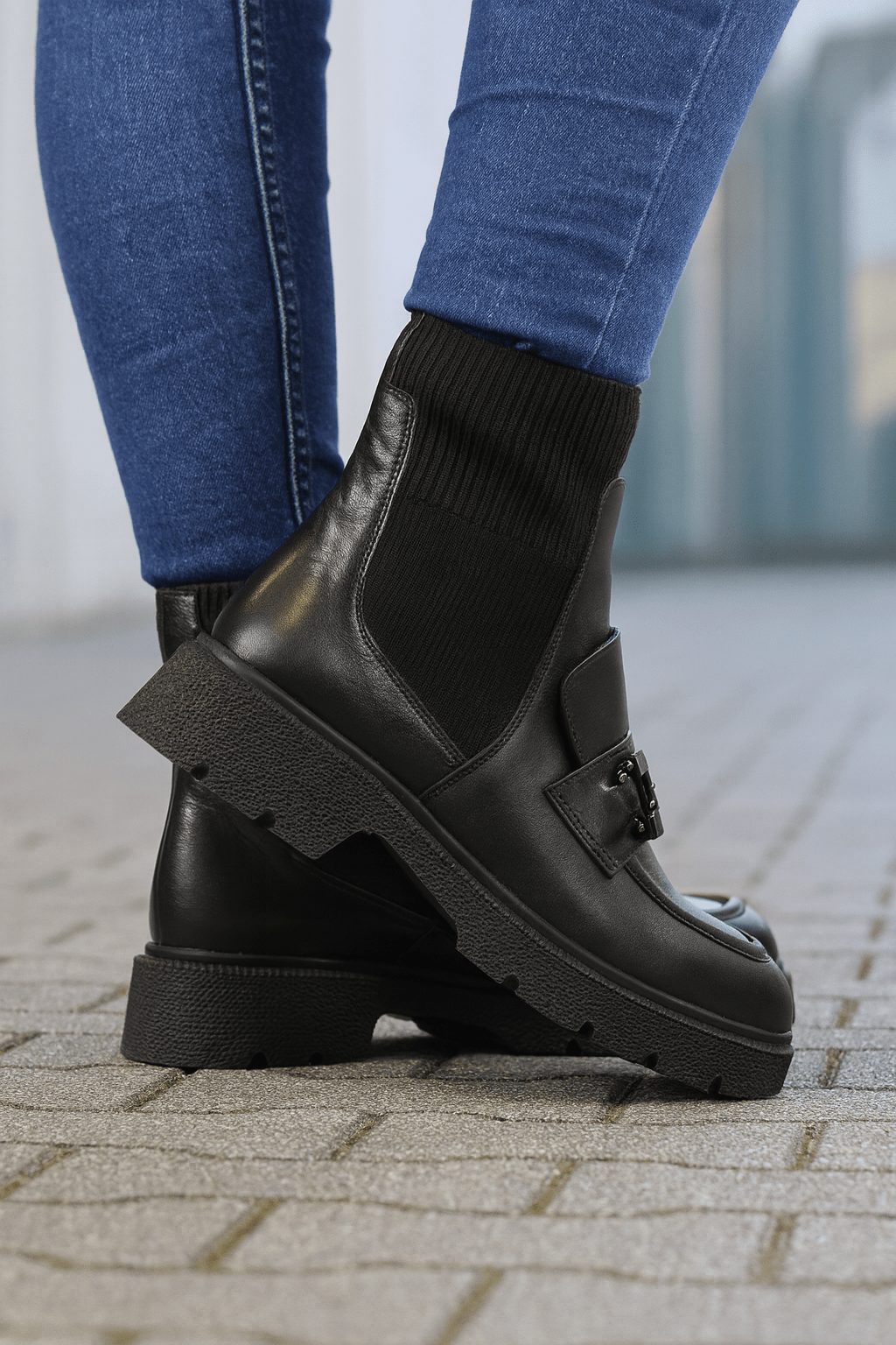 Adaugă o notă modernă ținutelor tale cu aceste ghete damă din piele naturală neagră, concepute pentru confort și stil contemporan. Partea superioară din material textil elastic tip ciorap strech oferă o potrivire perfectă și un aspect elegant, iar accesoriul metalic din față adaugă un detaliu rafinat.