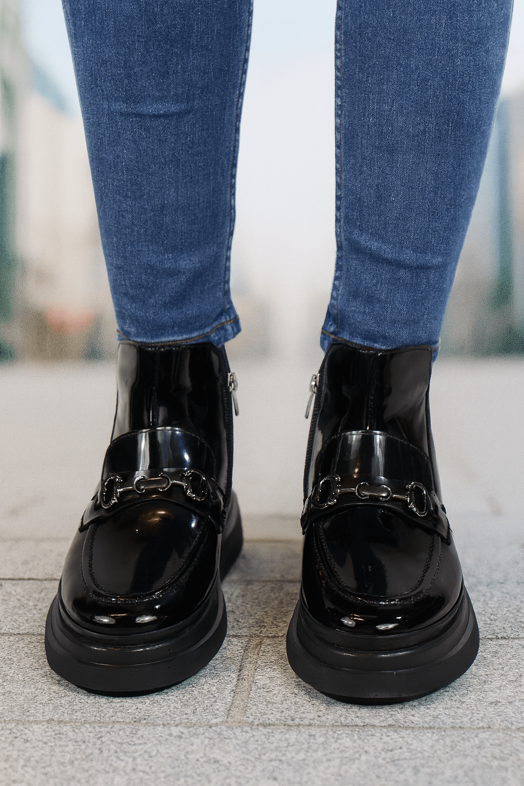 Descoperă echilibrul perfect între eleganță și confort cu aceste ghete damă din piele lacuita naturală neagră, decorate cu un accesoriu metalic modern pe partea frontală. Designul versatil și silueta rafinată transformă acest model într-o alegere ideală pentru ținutele de zi cu zi, fără a compromite stilul.