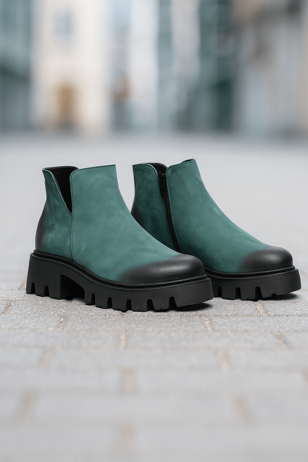 Alege stilul urban modern cu aceste ghete damă confecționate din piele naturală nubuk verde, cu o talpă groasă și zimțată care oferă aderență excelentă și confort în fiecare pas.