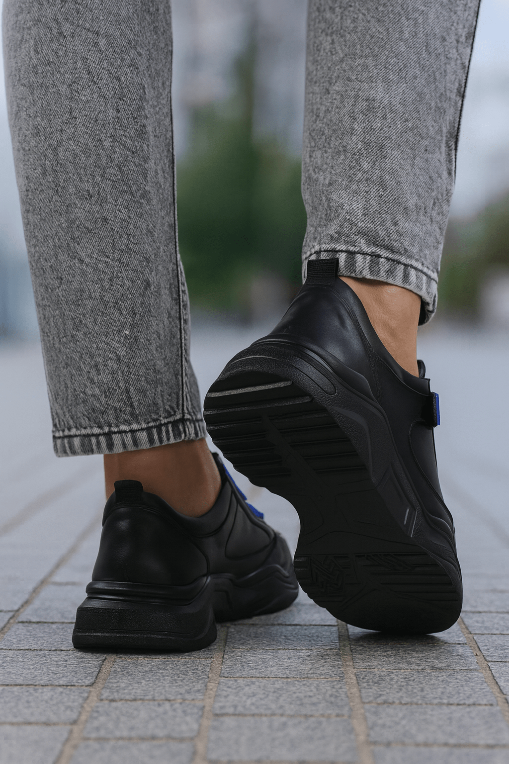 Talpa masivă și ergonomică asigură stabilitate și confort pe tot parcursul zilei, fiind ideală pentru plimbări urbane, ținute streetwear sau activități de zi cu zi. Designul îmbină perfect eleganța pielii negre premium cu accente sportive, transformând acest model într-o alegere potrivită pentru cei care își doresc un look modern și nonconformist.