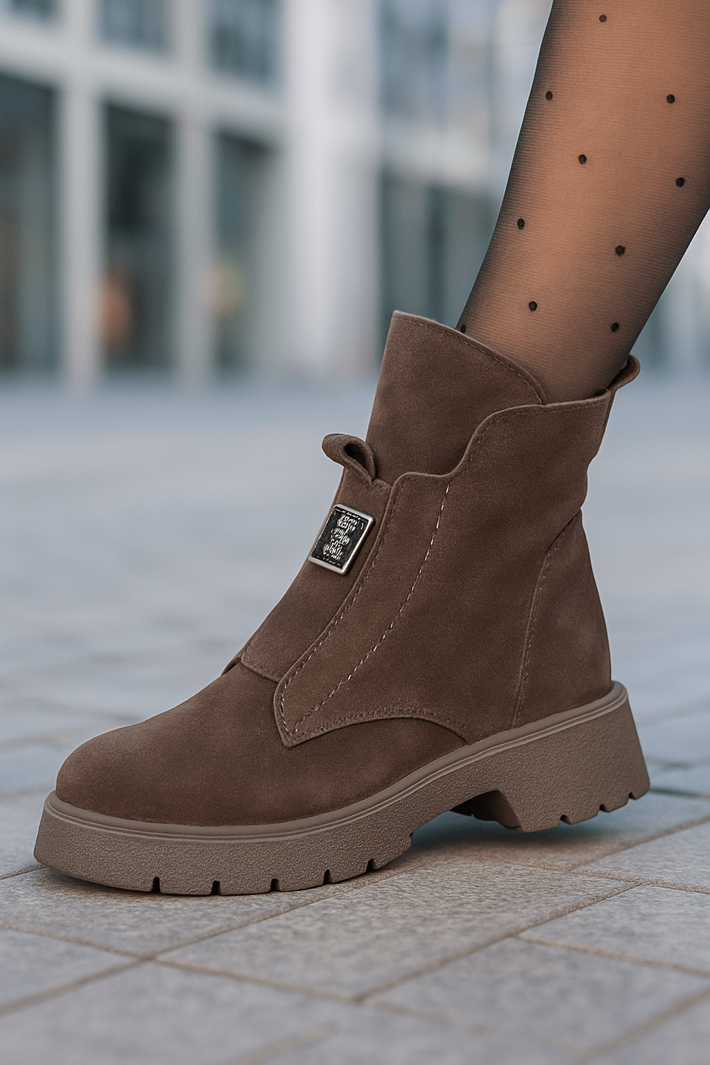 Descoperă confortul și stilul modern cu aceste ghete damă din piele naturală întoarsă în nuanța caldă de maro ciocolatiu. Designul simplu și elegant este pus în valoare de insigna metalică frontală decorativă, care adaugă o notă distinctă și rafinată.
