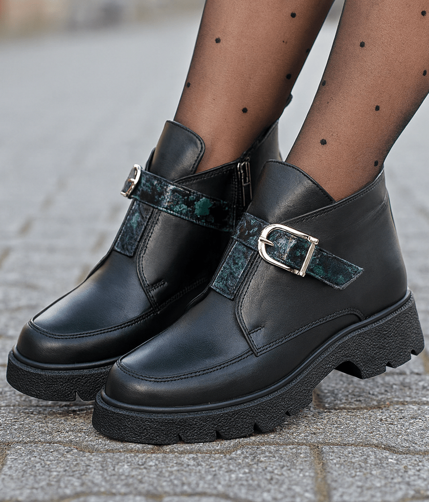 Aceste ghete damă din piele naturală PREMIUM neagră îmbină perfect confortul cu eleganța modernă. Modelul este pus în valoare de banda decorativă cu imprimeu animal print și de catarama metalică argintie, care adaugă un plus de stil și unicitate.