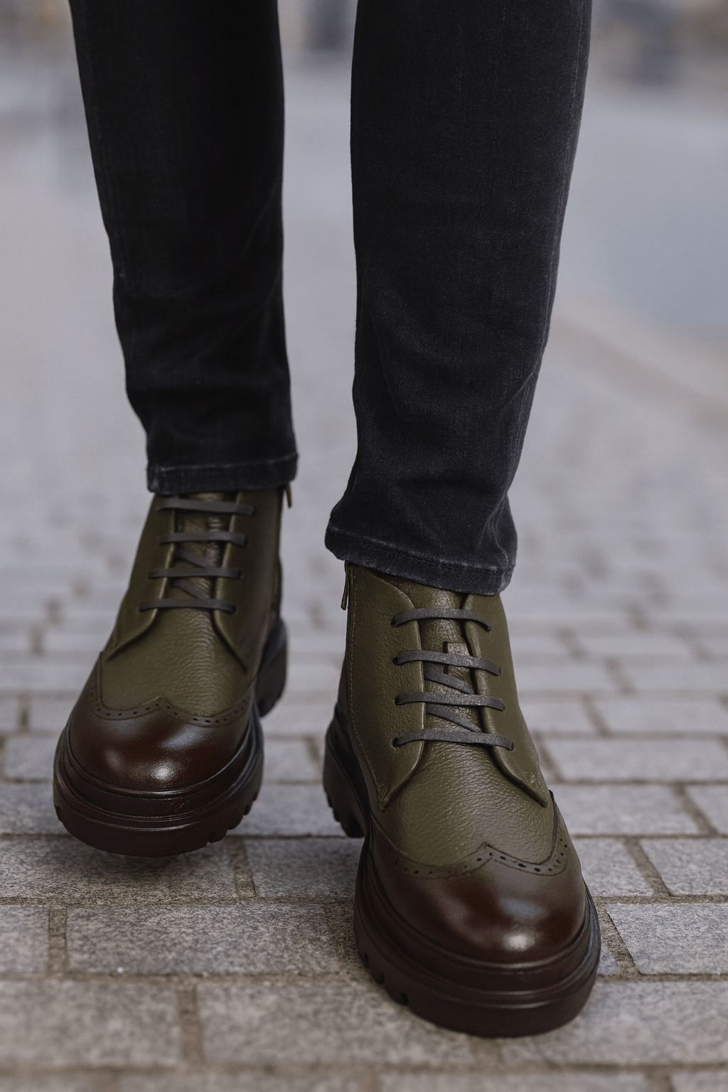 Designul combină stilul clasic brogue, evidențiat prin perforațiile decorative, cu accente contemporane precum fermoarul lateral practic, care permite o încălțare rapidă. Pielea naturală texturată garantează rezistență și un aspect premium, iar nuanța verde închis, cu detalii maro, adaugă originalitate și versatilitate.