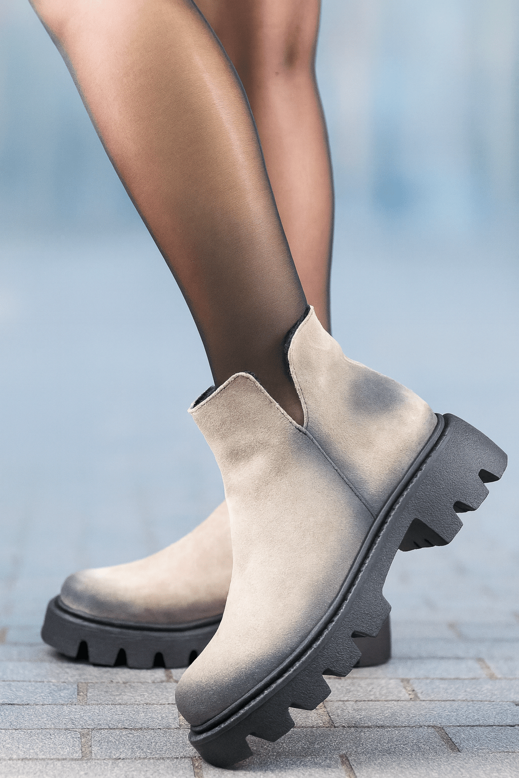 Alege stilul urban modern cu aceste ghete damă confecționate din piele naturală întoarsă Bej, cu o talpă groasă și zimțată care oferă aderență excelentă și confort în fiecare pas.