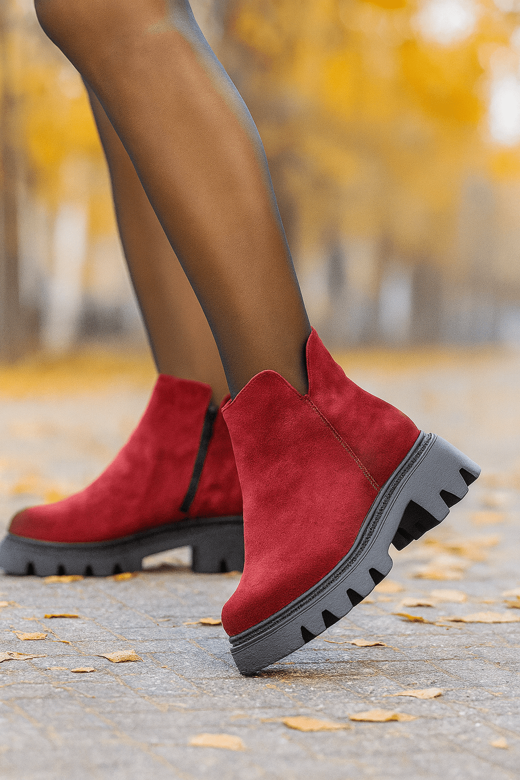Alege stilul urban modern cu aceste ghete damă confecționate din piele naturală întoarsă bordo, cu o talpă groasă și zimțată care oferă aderență excelentă și confort în fiecare pas.