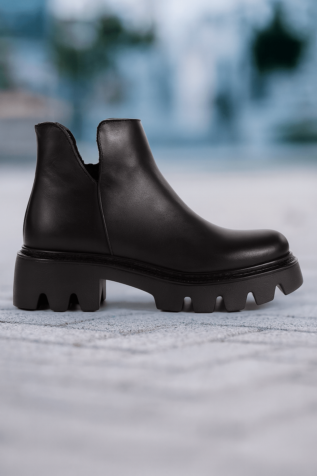Alege stilul urban modern cu aceste ghete damă confecționate din piele naturală box neagră, cu o talpă groasă și zimțată care oferă aderență excelentă și confort în fiecare pas.