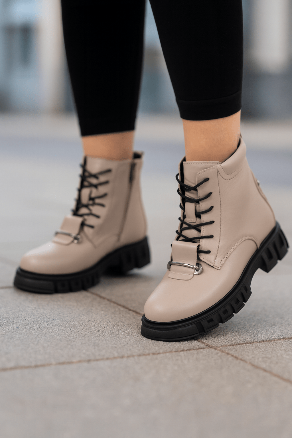 Cucerește sezonul rece cu acești bocanci din piele naturală bej taupe, perfecți pentru un look modern și puternic. Realizați din piele premium, oferă confort, stabilitate și durabilitate, având o talpă neagră groasă, antiderapantă, potrivită pentru zilele reci sau ploioase.