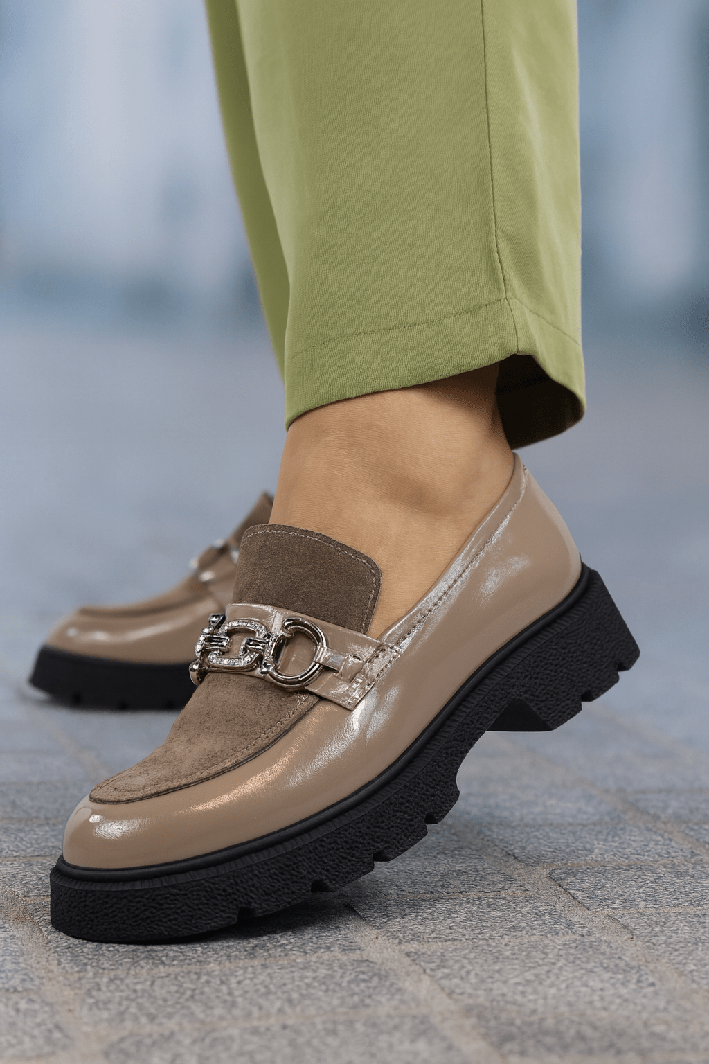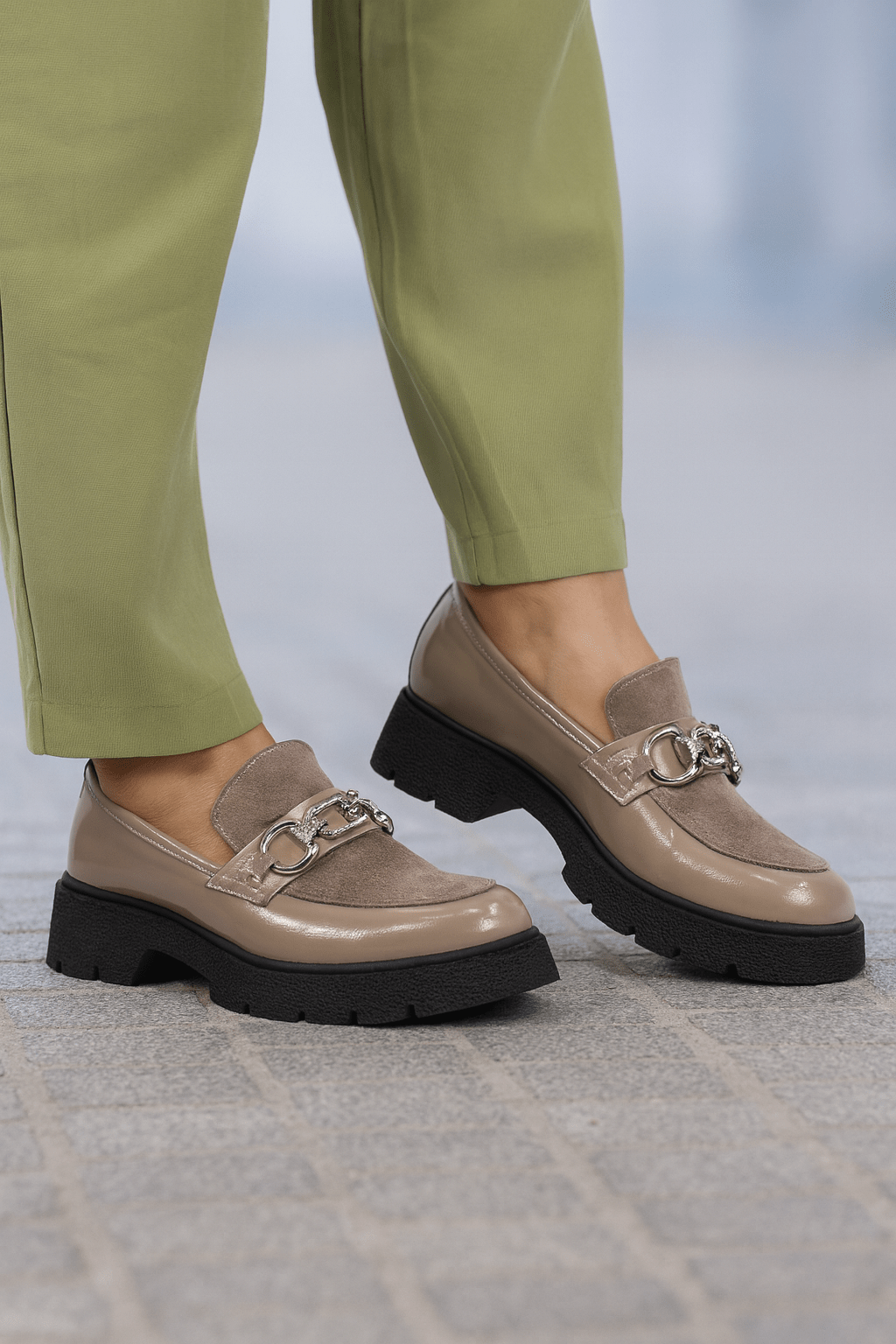 Pantofi Casual gen Loafers damă din piele naturală bej-taupe, combinație lăcuită și piele întoarsă, cu accesoriu metalic