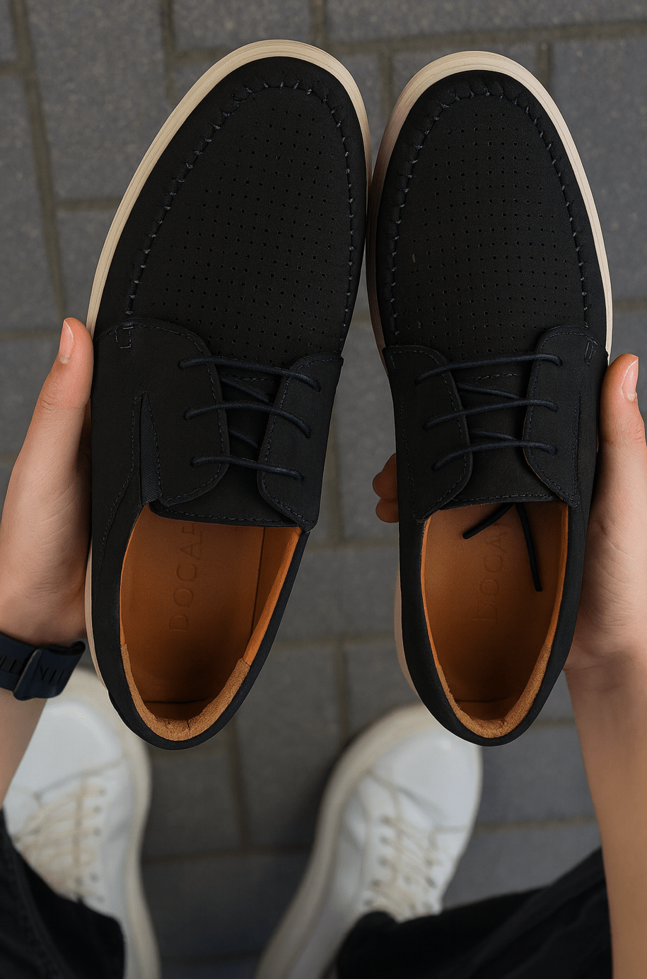 Adaugă un plus de stil garderobei tale cu acești pantofi casual pentru bărbați, confecționați din piele naturală nubuk negri de înaltă calitate. Designul lor elegant și versatil îi face ideali pentru ținute de zi cu zi, dar și pentru ocazii smart-casual.