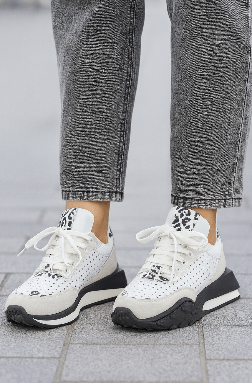 Pantofi sport damă albi din piele naturală, cu perforații și detalii animal print