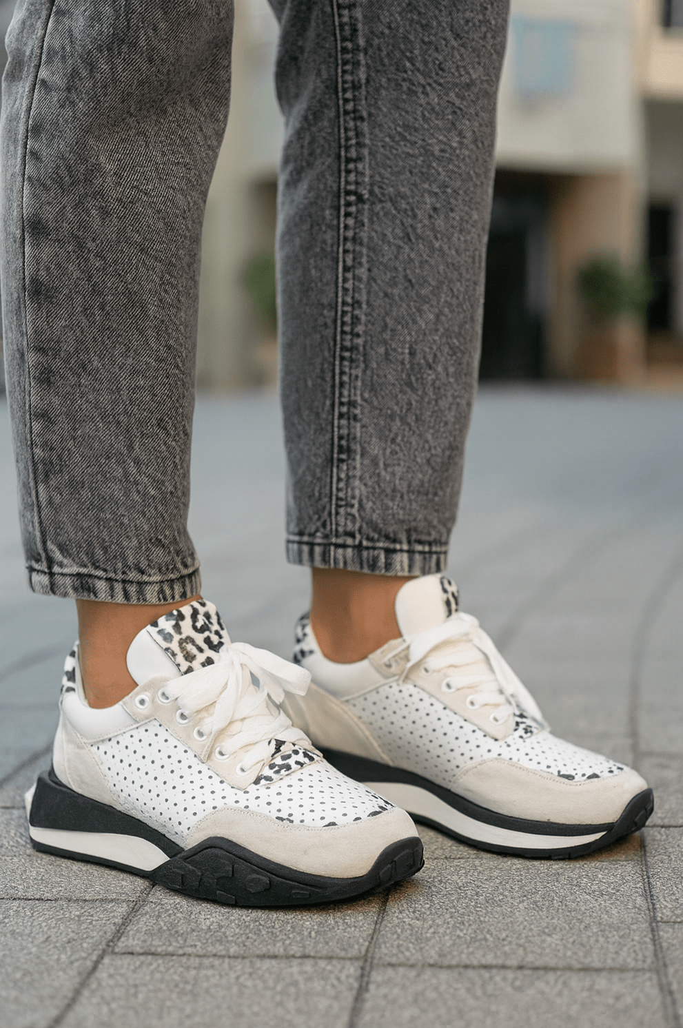 Completează-ți look-ul urban cu acești pantofi sport pentru damă, confecționați din piele naturală albă, cu perforații moderne și accente animal print. Designul fresh și trendy îi face ideali pentru femeile care doresc să combine confortul cu un stil actual și îndrăzneț.