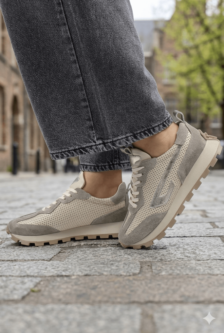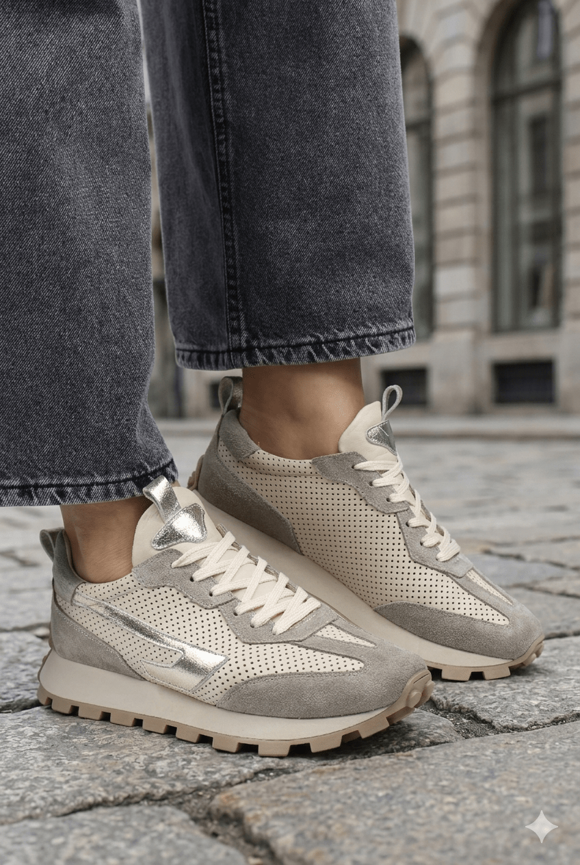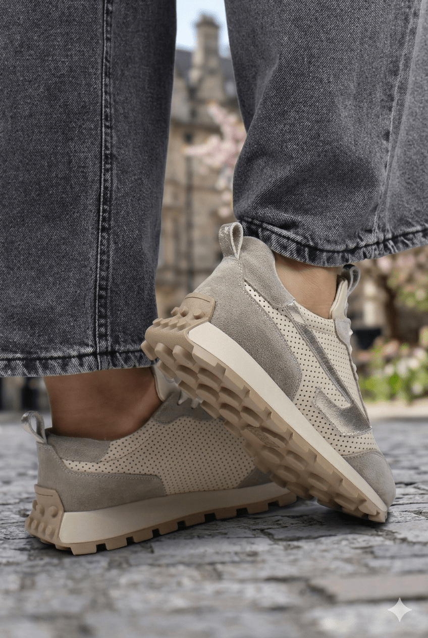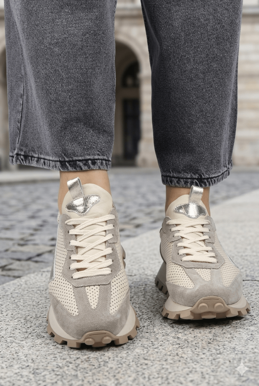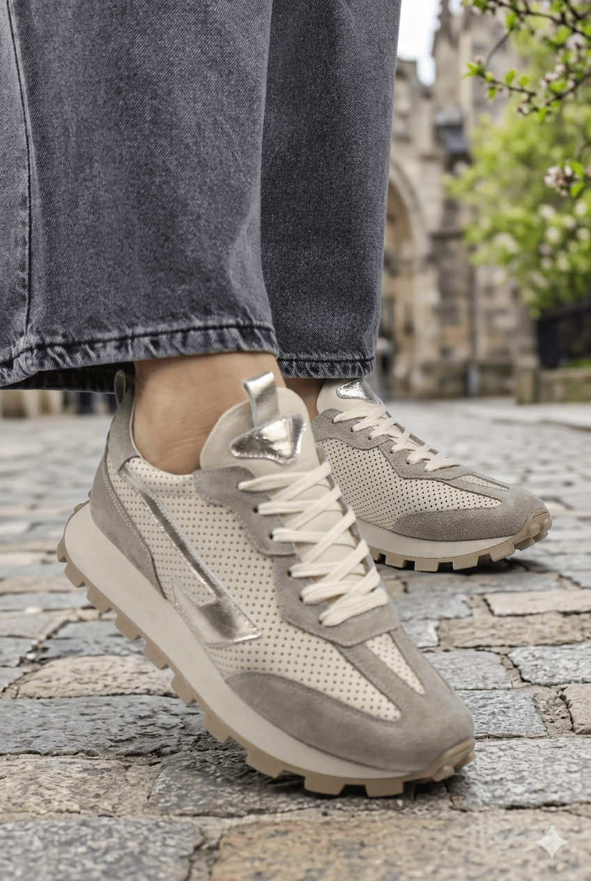 Acești pantofi sport damă îmbină perfect confortul zilnic cu un design fresh, inspirat din stilul urban modern. Realizați din piele naturală perforată bej, cu inserții din piele întoarsă gri, modelul oferă respirabilitate excelentă și o senzație plăcută la purtare.