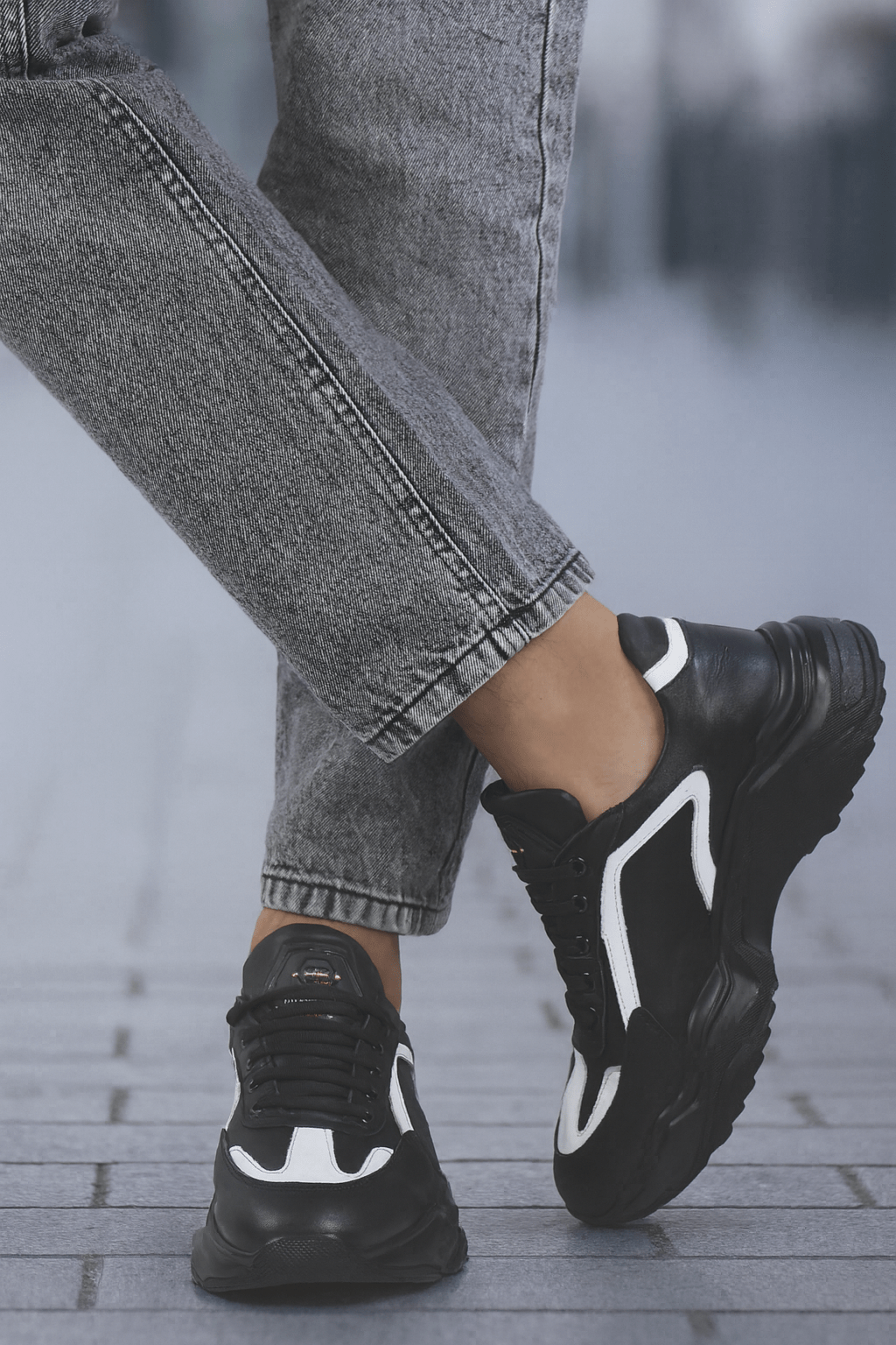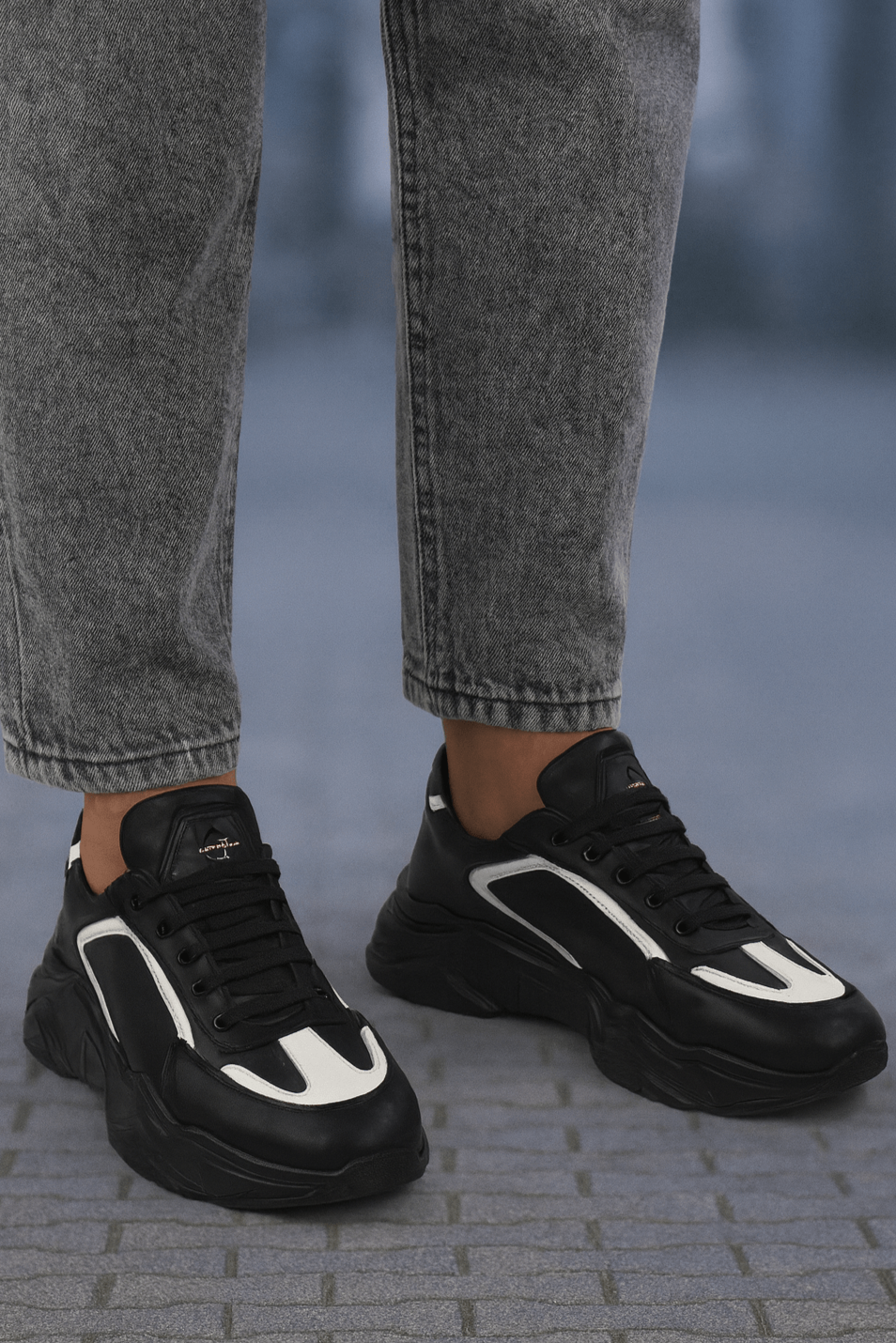 Pantofi sport bărbați din piele naturală negru cu alb, cu talpă masivă și design modern