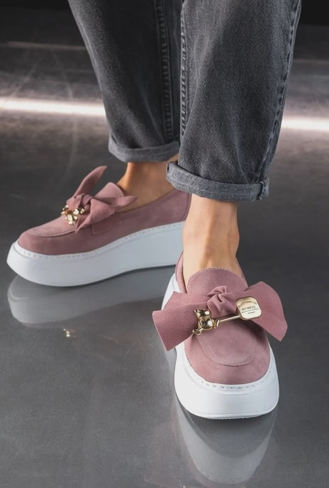 ,,Casilda'' este un model exclusivist de mocasini damă roz- pudră, din piele naturală întoarsă, combinația perfectă între eleganță, confort și un stil fashion impecabil. Construiți din piele naturală de calitate superioară, acești pantofi casual damă oferă o senzație plăcută la purtare, fiind moi, usori și extrem de confortabili. Designul impresionant, cu fundiță și un accesoriu metalic, inspiră un vibe optimist si curajos, iar talpa groasă, ultra-light, îti oferă confort și durabilitate. Alege modelul ,,Casilda'' pentru o vestimentație casual- office, de primăvară-vară, și împrospătează-ți garderoba!