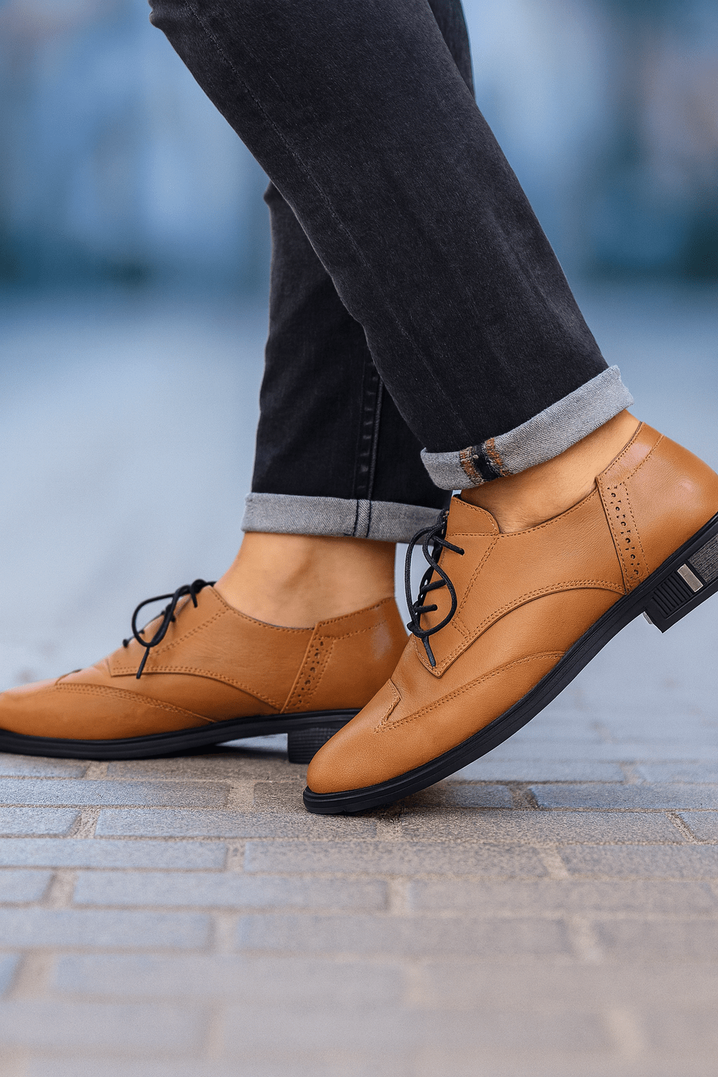 Pantofi Casual eleganți damă din piele naturală maro camel, cu șireturi și design clasic