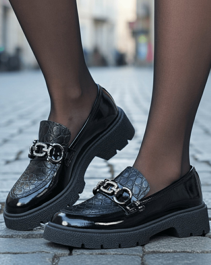 Loafers damă din piele naturală lacuita neagră cu textură croco și talpă groasă captusiti cu piele naturala la interior si brant cu memorie pentru super confort.