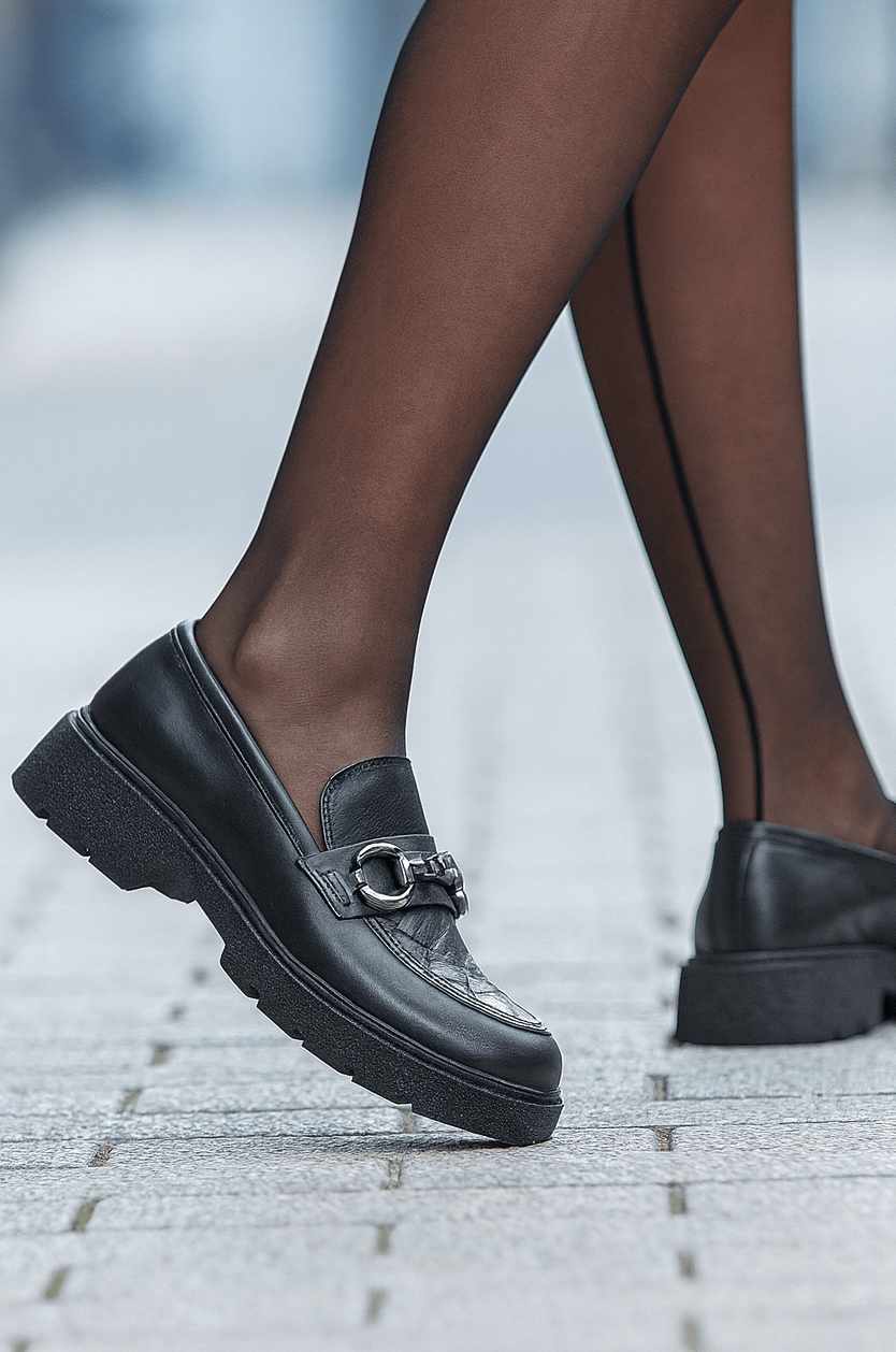 Loafers damă din piele naturală neagră cu textură croco și talpă groasă captusiti cu piele de cea mai buna calitate la interior si brant cu memorie pentru cel mai bun confort.