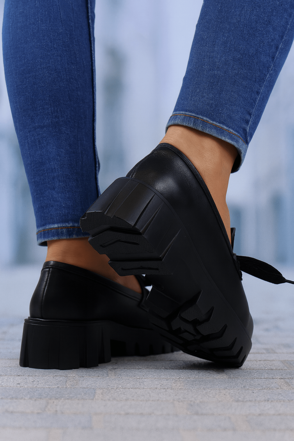 Pantofii damă din piele neagră cu talpă groasă sunt alegerea perfectă pentru femeile care vor să îmbine confortul cu un design chic și actual.