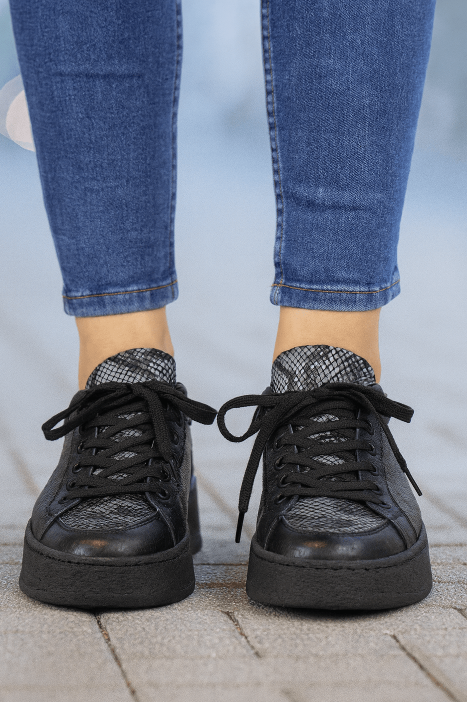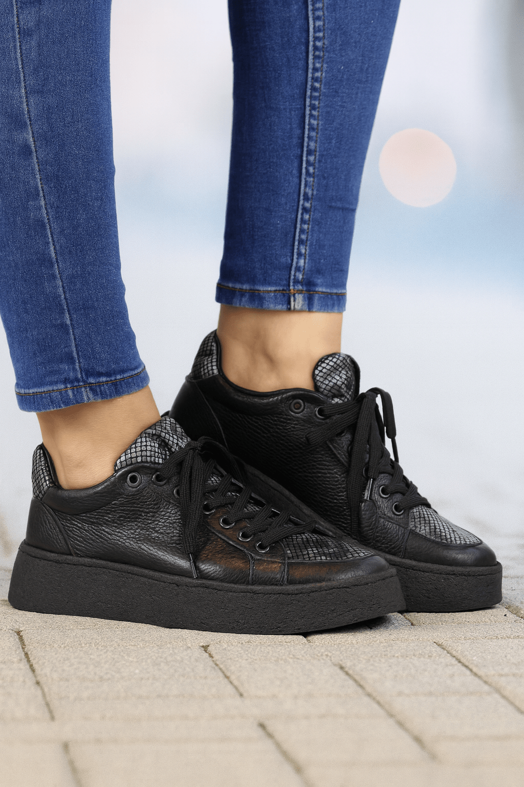 Alege un look modern și confortabil cu acești pantofi sport din piele naturală neagră, perfecți pentru outfiturile casual sau street style. Designul este completat de inserțiile elegante cu textură tip șarpe și de talpa înaltă care oferă un plus de stil și stabilitate.