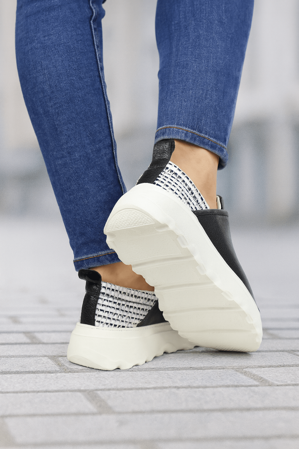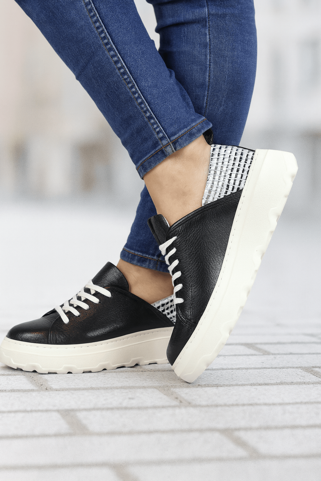 Pantofi sport damă din piele naturală negri cu alb și imprimeu texturat