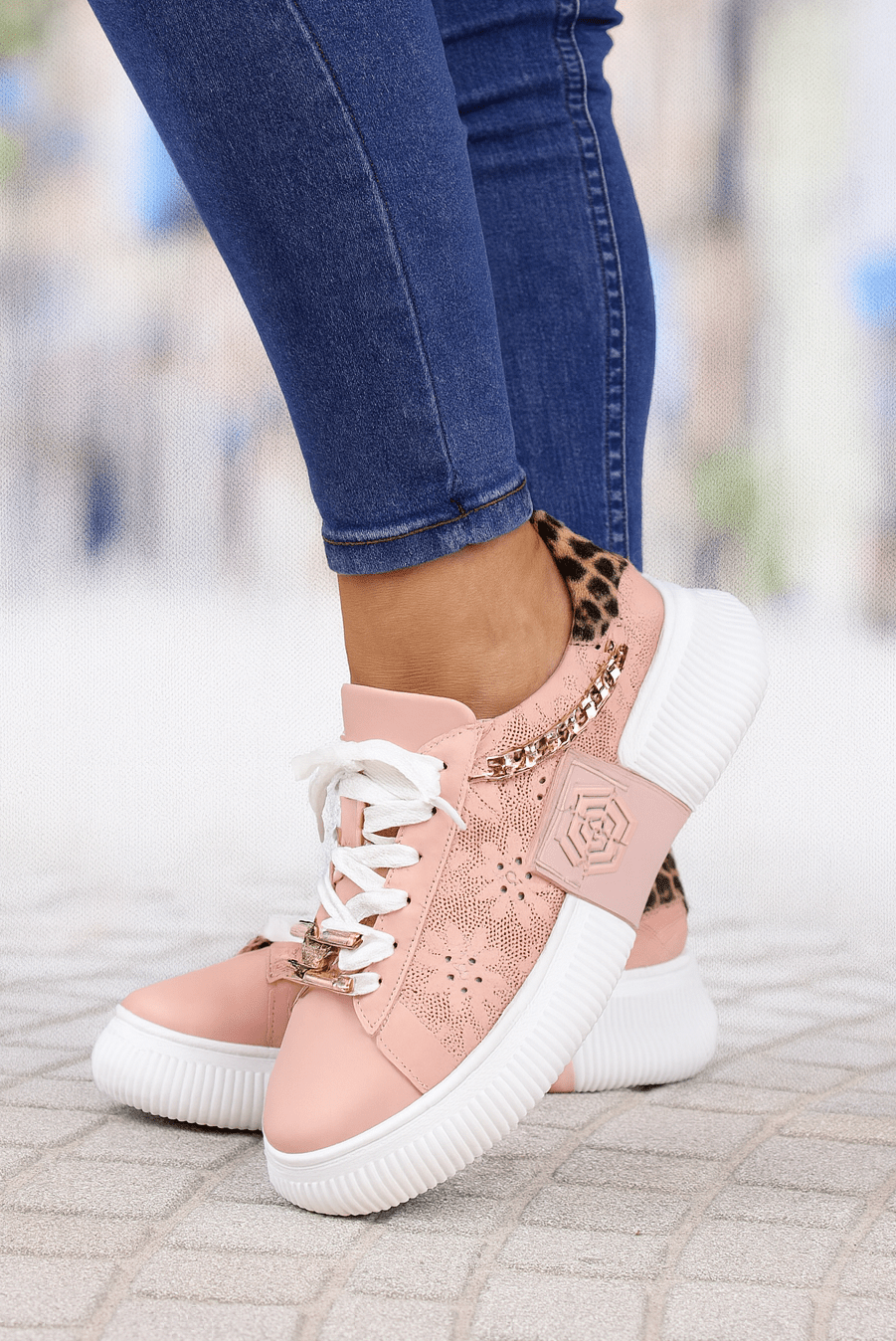 Pantofi sport damă roz pudră din piele naturala cu detalii animal print și accesoriu lanț decorativ