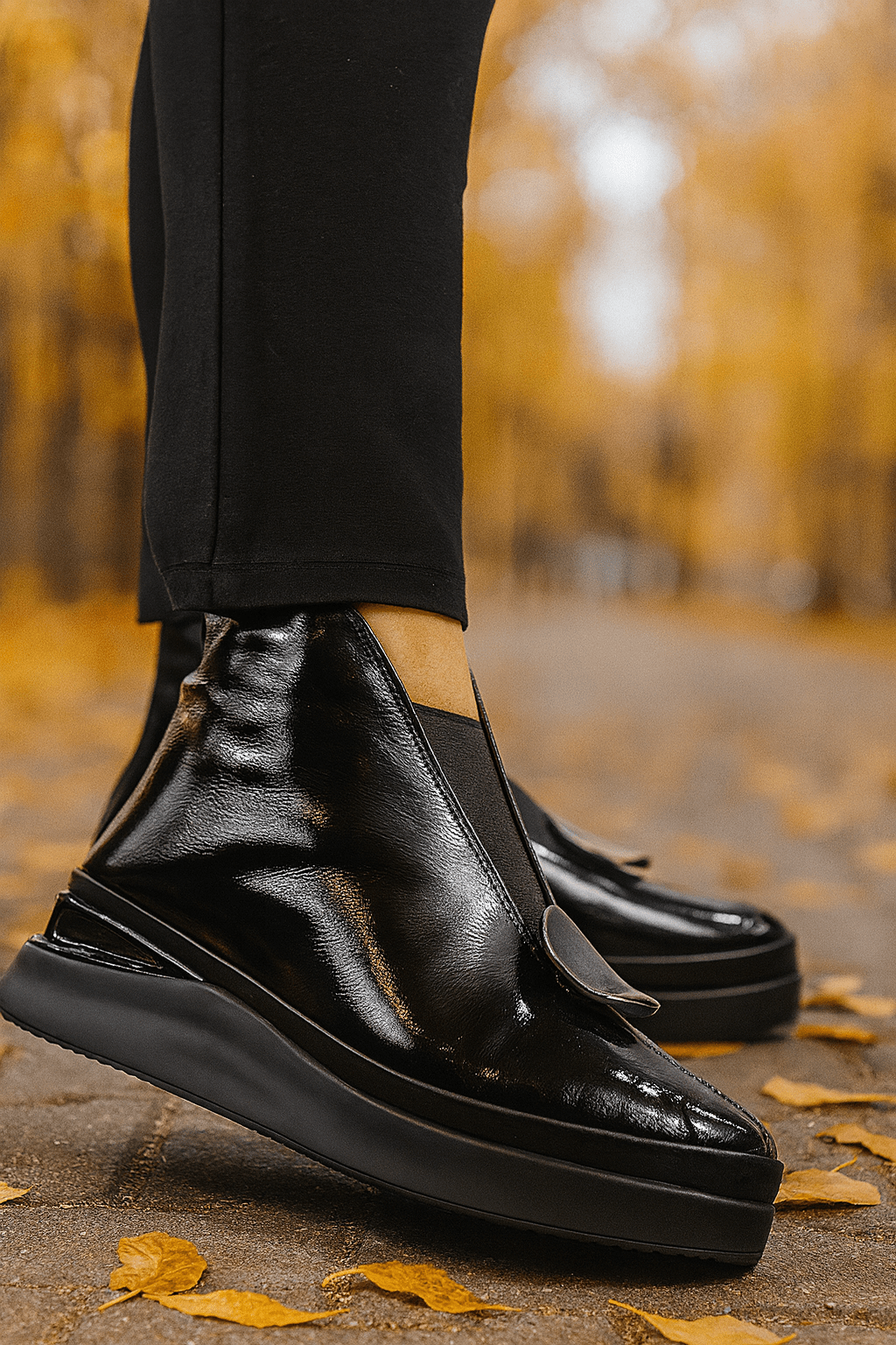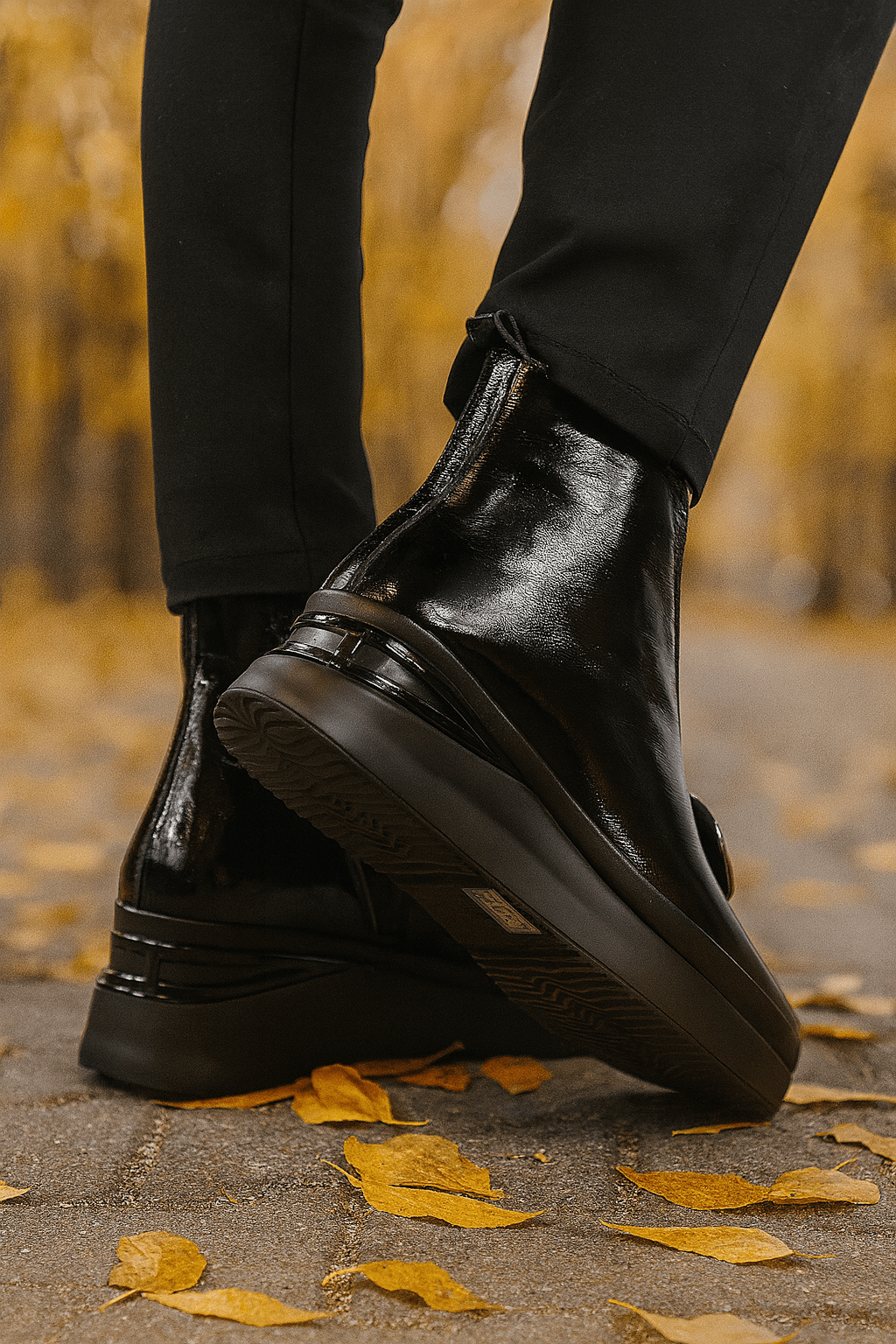 Un model care iese instant în evidență: aceste ghete damă din piele naturală lăcuită, în nuanța intensă de negru, sunt concepute pentru femeile care vor un look modern, elegant și confortabil în același timp.