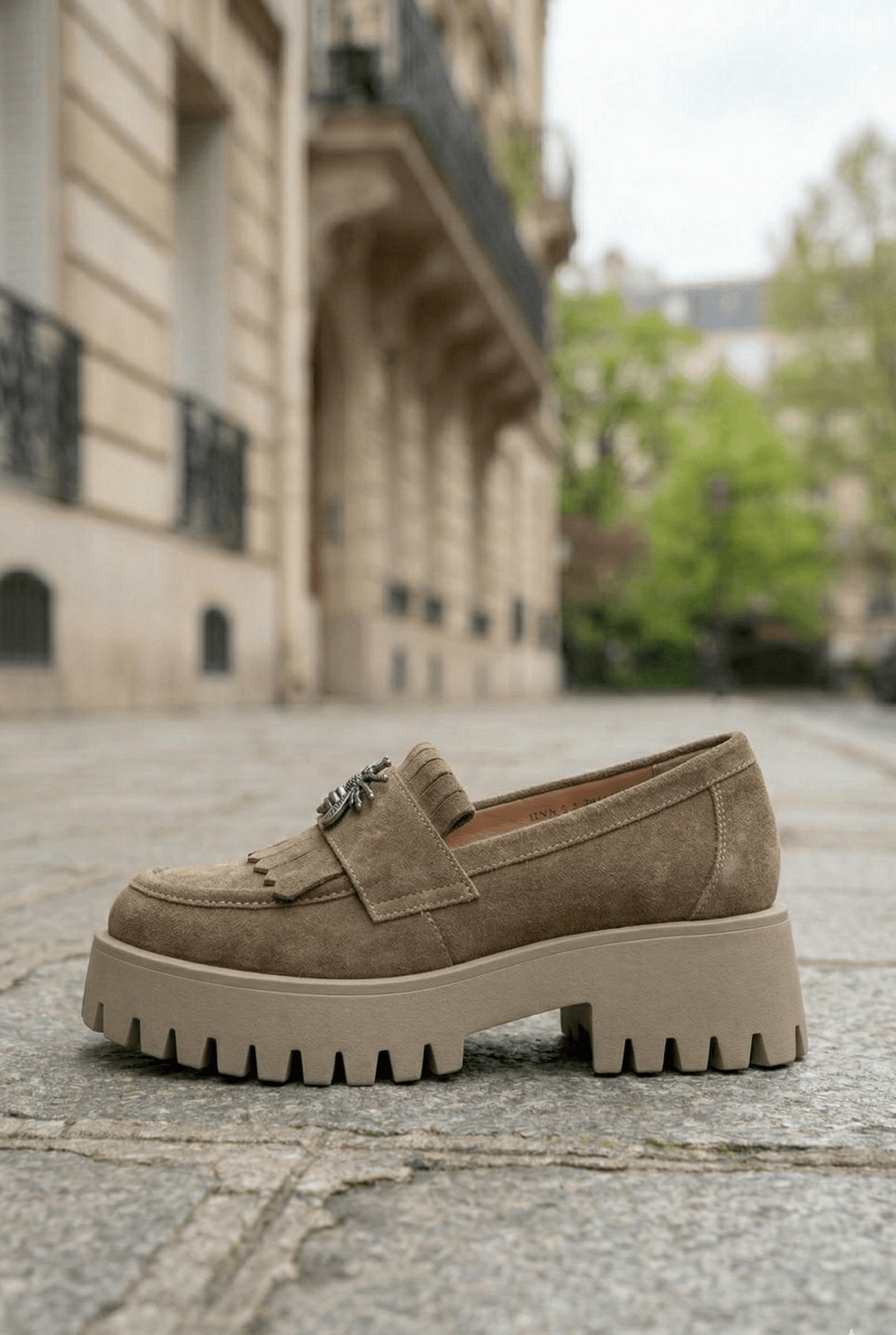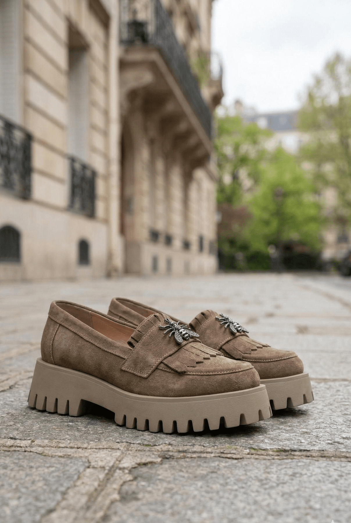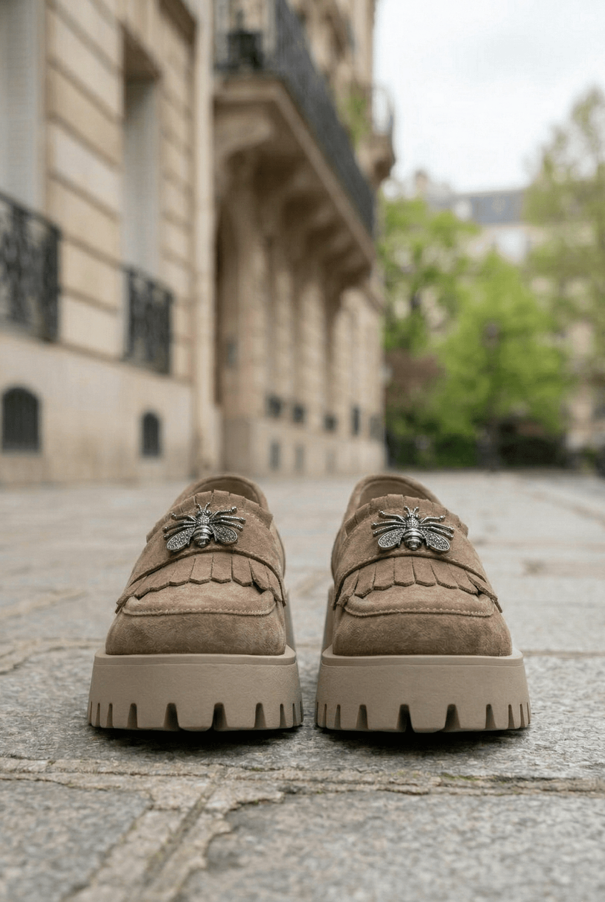Descoperă eleganța îndrăzneață și confortul de neegalat cu acești mocasini damă maro din piele intoarsa, perfecți pentru sezonul primăvară-vară. Confecționați din piele naturală premium și având talpa moale, acești mocasini oferă durabilitate, flexibilitate și respirabilitate, fiind ideali pentru purtarea zilnică. Talpa groasă crestată asigură stabilitate, aderență și confort, făcând fiecare pas mai sigur și mai relaxat. Designul contemporan este accentuat de accesoriul metalic frontal sub formă de albină, un detaliu chic care adaugă un look modern și sofisticat. Conferă unicitate ținutelor tale purtând modelul ,,Marbella''!
