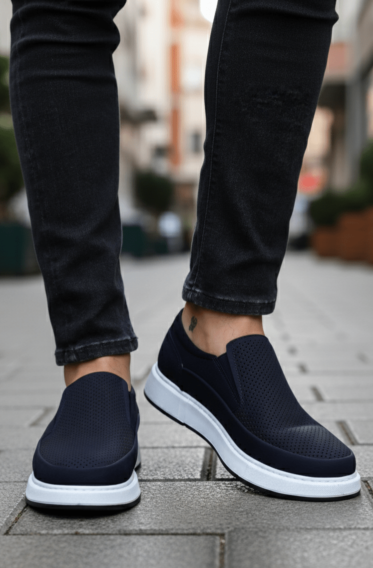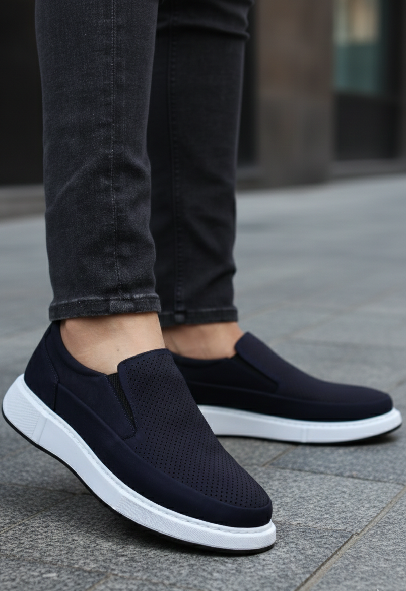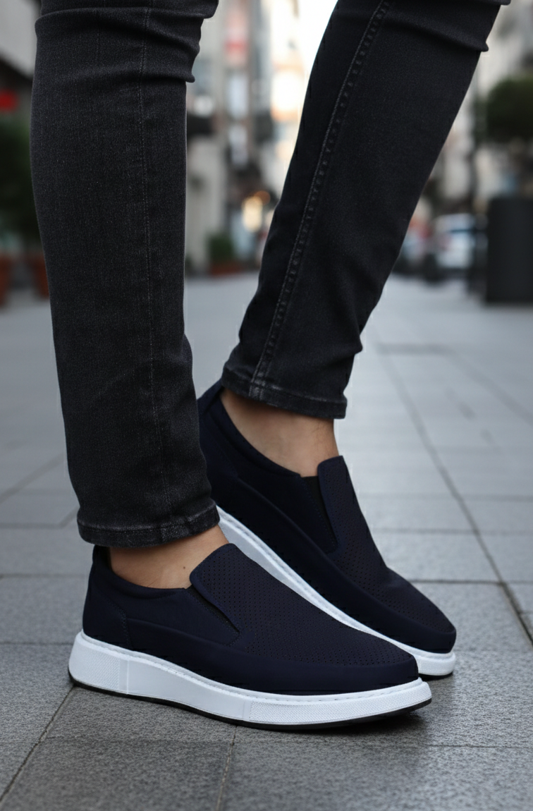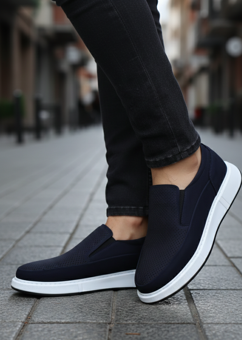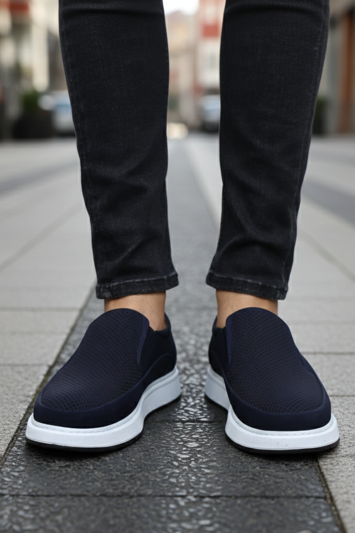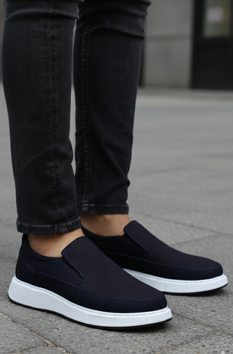 Design slip-on fără șireturi, piele naturală Albastru-Bleumarin perforată pentru respirabilitate și talpă alb contrast care oferă un look modern, curat.
