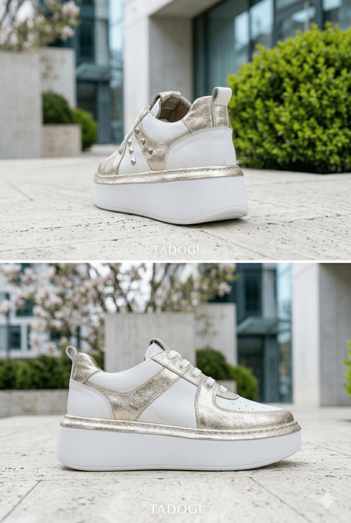Adaugă un plus de stil și personalitate ținutelor tale cu acești sneakers dama din piele naturală, într-o combinație modernă de alb și auriu. Designul cu platformă și accente metalice transformă acest model într-o alegere statement, perfectă pentru femeile care vor să iasă în evidență printr-un look fresh și actual.